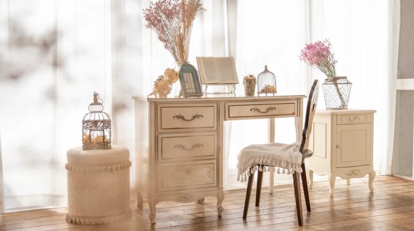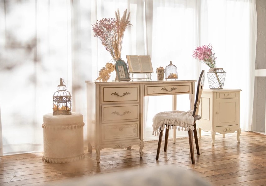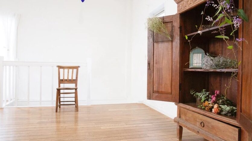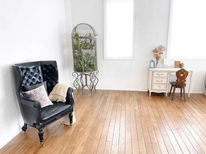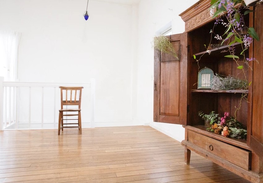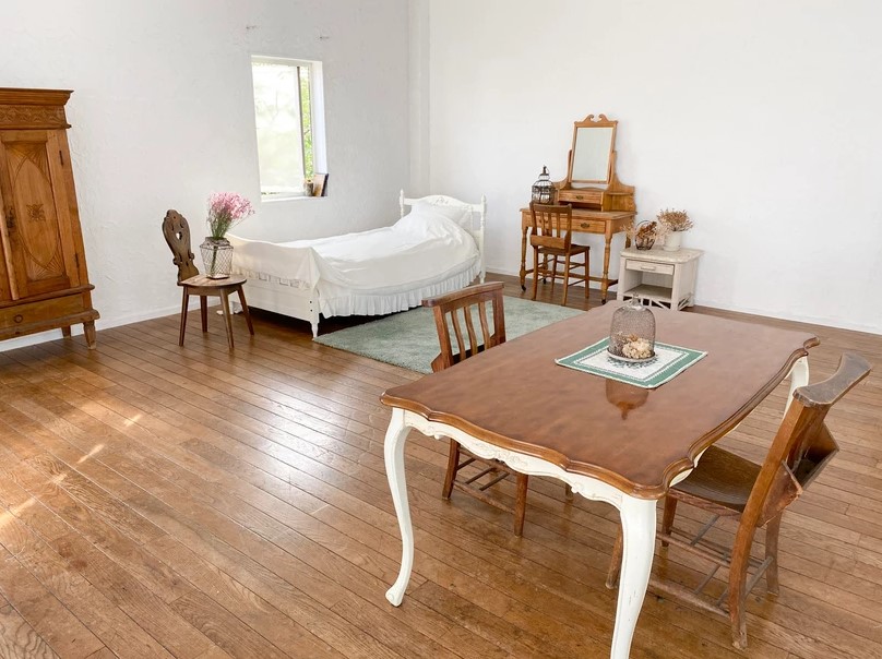2階はバーンウッド材のフローリングと白壁、漆喰壁というシンプルな部屋にシャビーシックな家具や小物が彩ります。