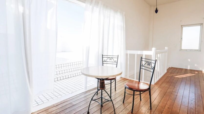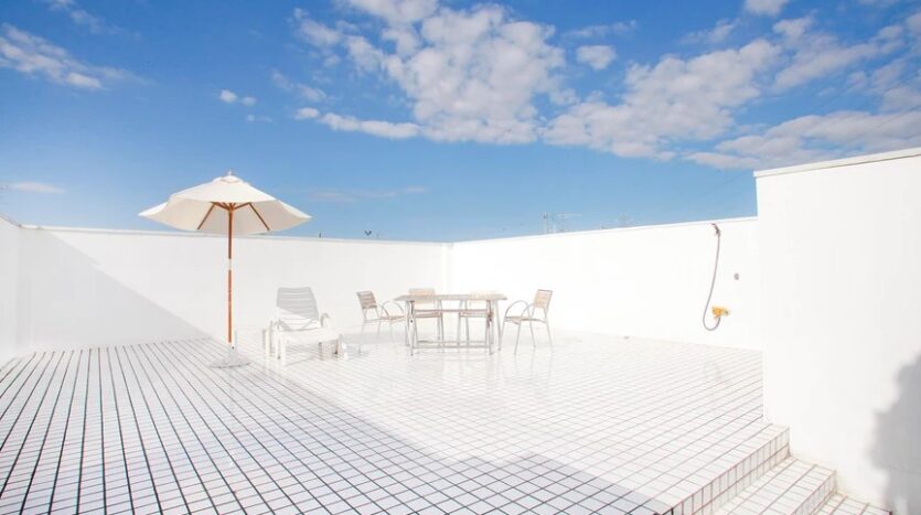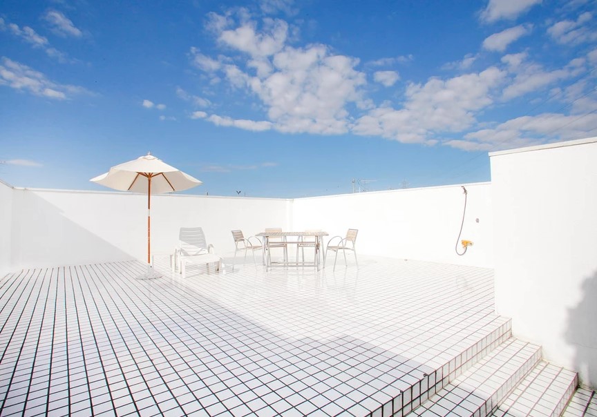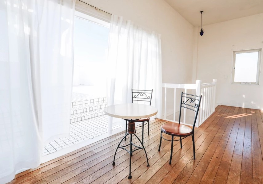 3階は無垢材のフローリングに白い漆喰塗りの壁、エイジング加工を施した扉や窓枠などの建具類、ナチュルテイストの家具類が常備されています。3面採光で、天気を選ばず自然光撮影が可能。天井高が3.1mあり、ペーパーを持ち込めばハウススタジオでありながらホリゾントスタジオの様な使い方もできます。また、白タイルを貼りつめたテラスは、ビーチにあるテラスのイメージで空抜けのカット撮影に利用可能です。