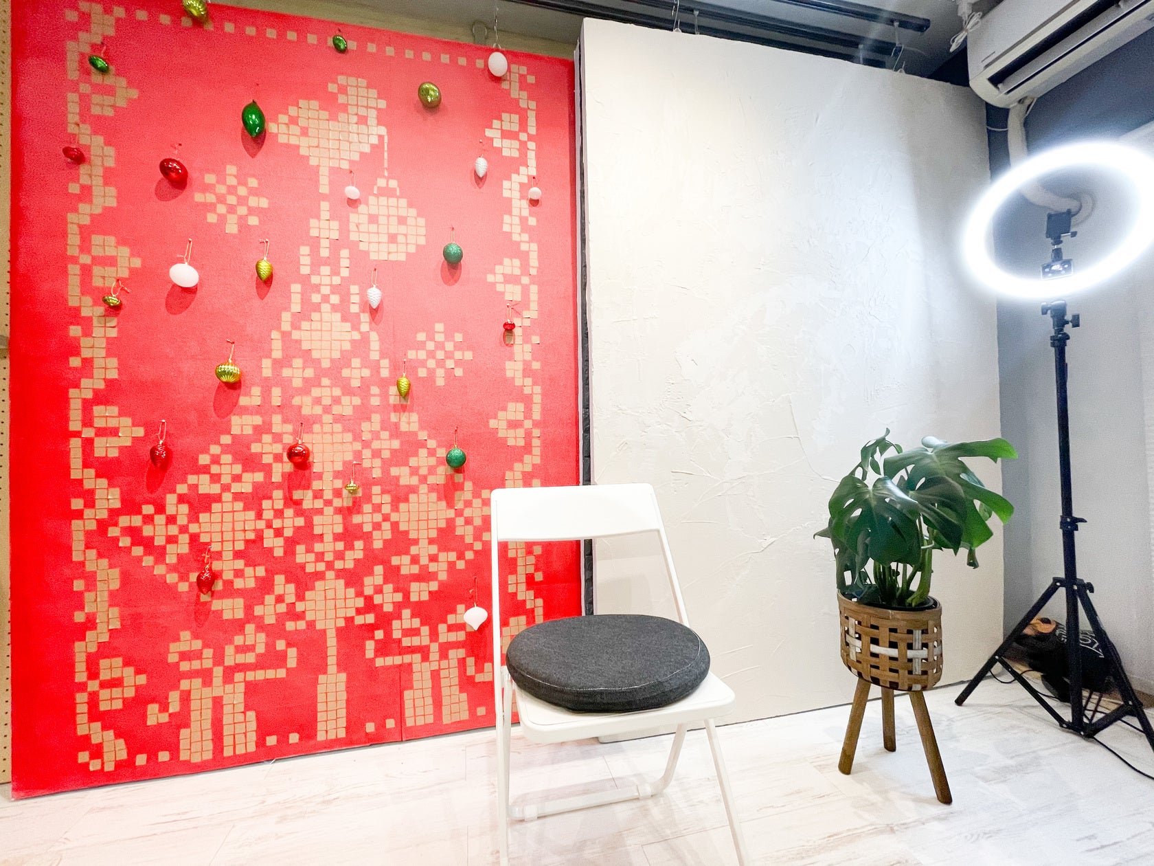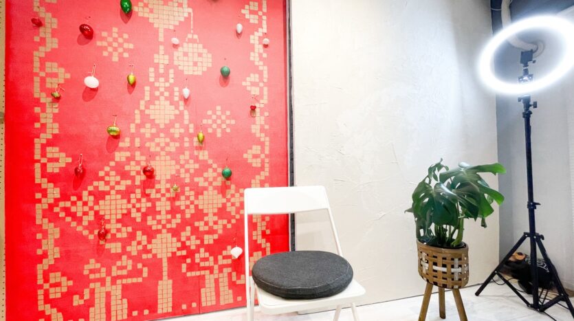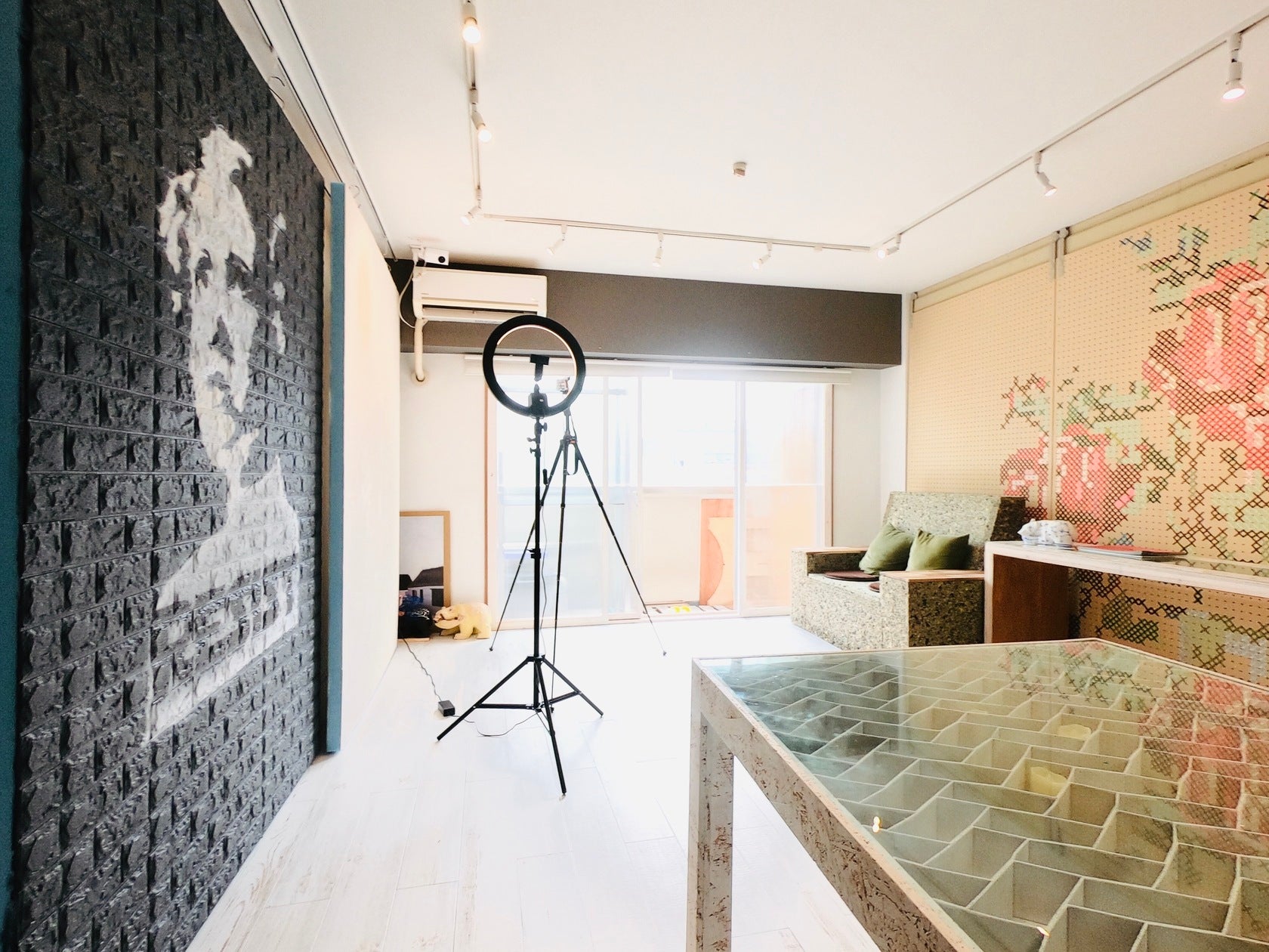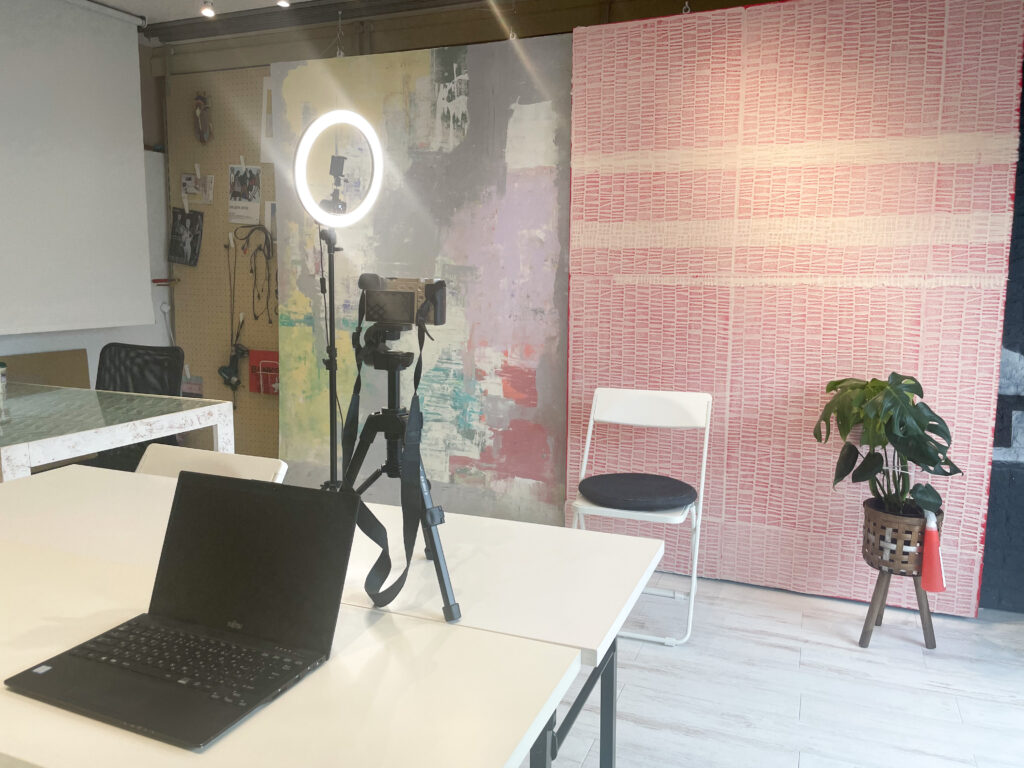 南向きの部屋で、やわらかな日差し差し込む空間で、自然光での撮影も可能。背景が気軽にアレンジできるスライド式となっており、漆喰壁やブルーレンガ、木目、もみの木など、撮影内容に合わせて選べる6パターンの背景を揃えています。