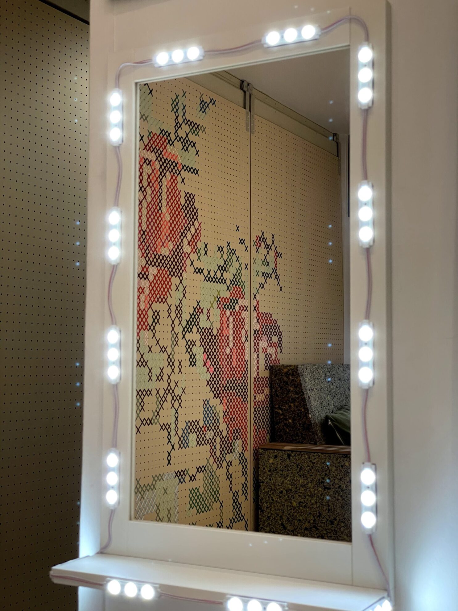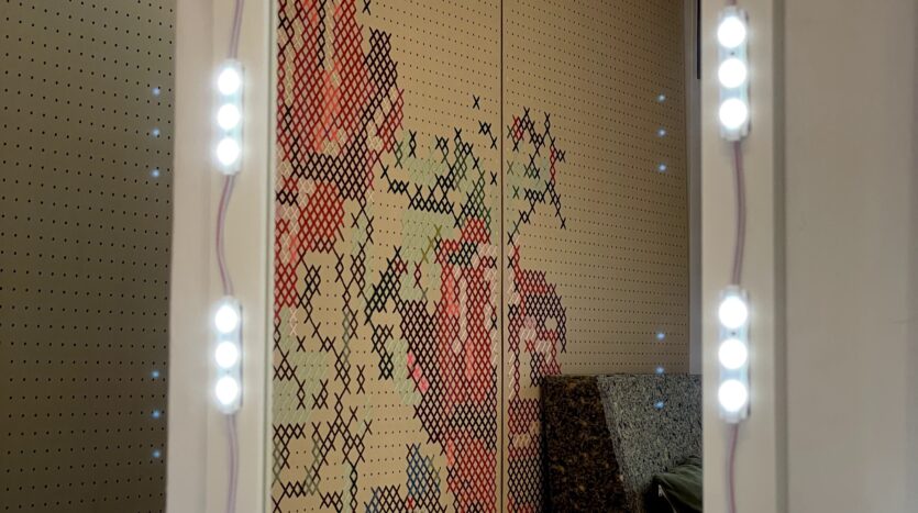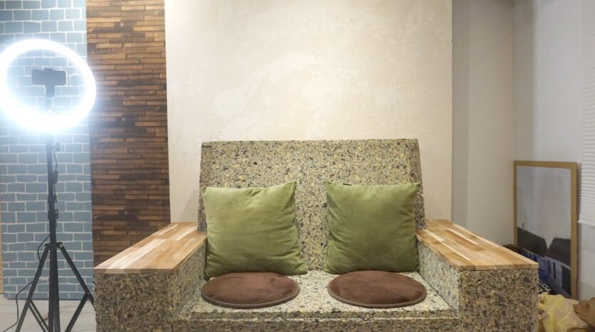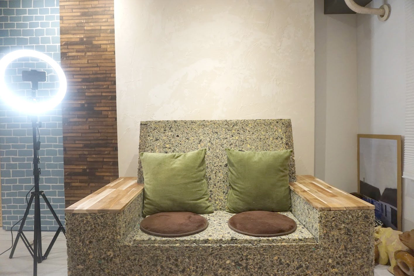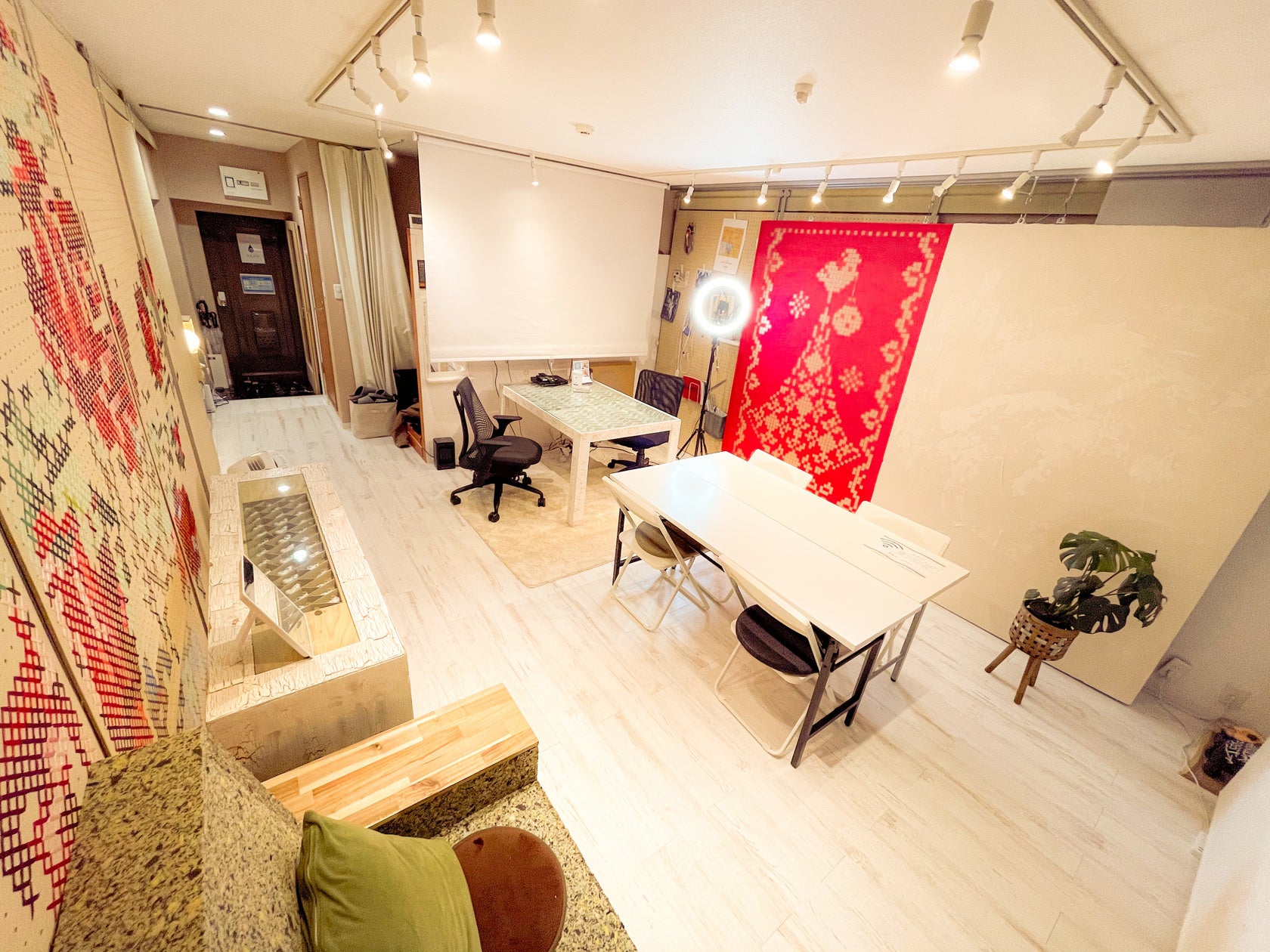 南向きの部屋で、やわらかな日差し差し込む空間で、自然光での撮影も可能。背景が気軽にアレンジできるスライド式となっており、漆喰壁やブルーレンガ、木目、もみの木など、撮影内容に合わせて選べる6パターンの背景を揃えています。