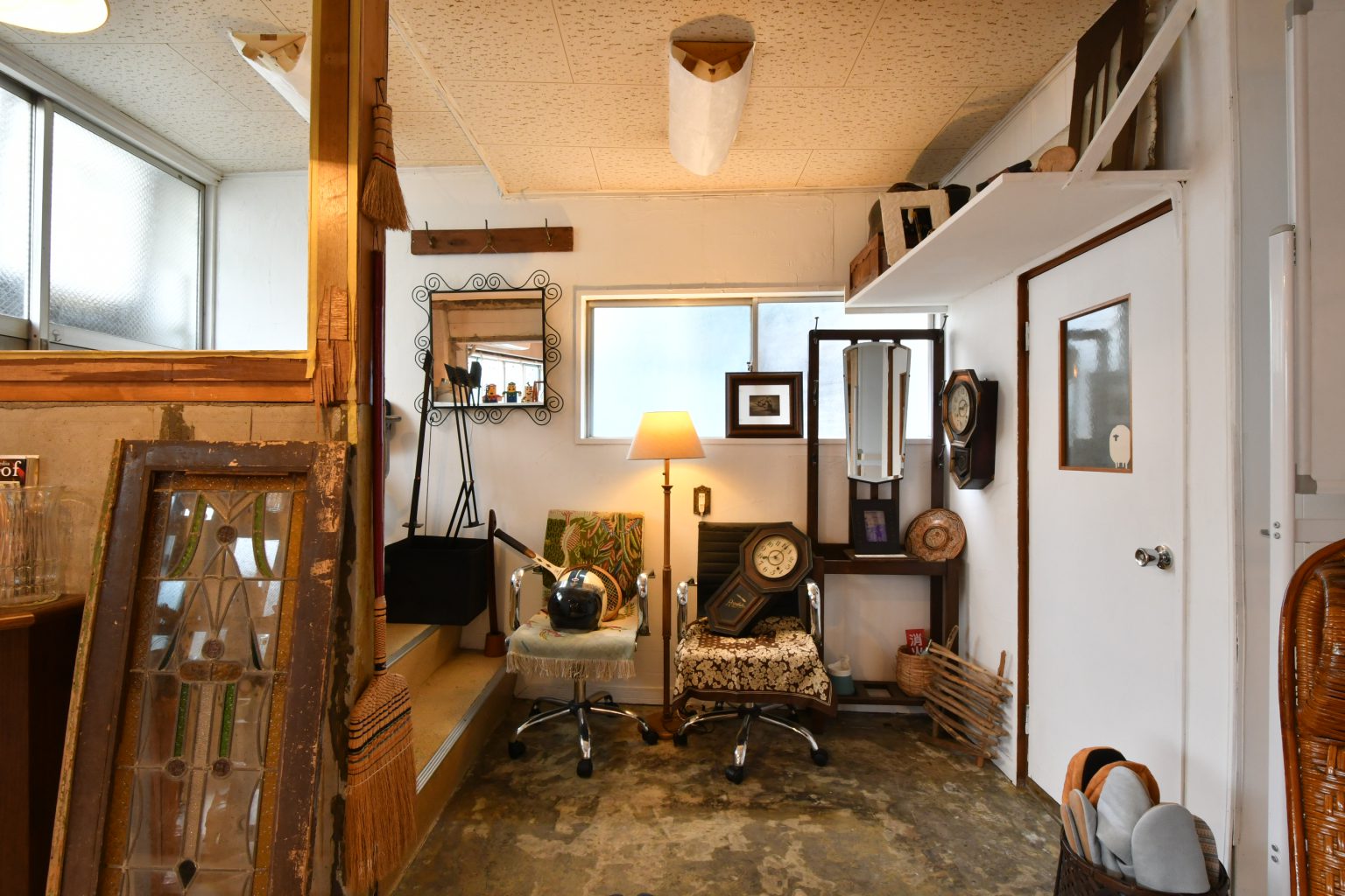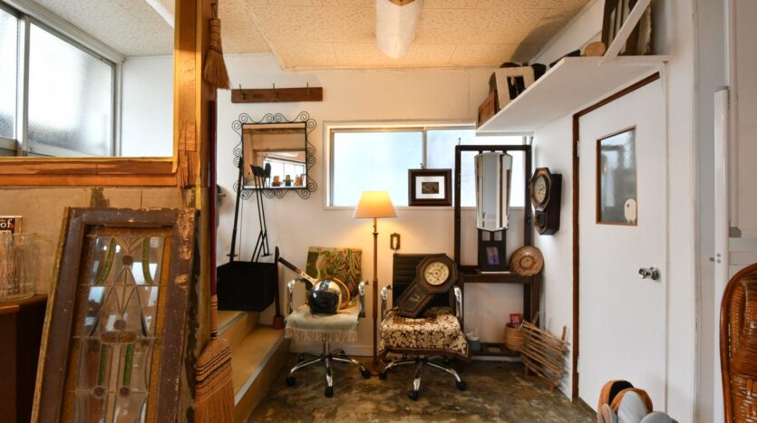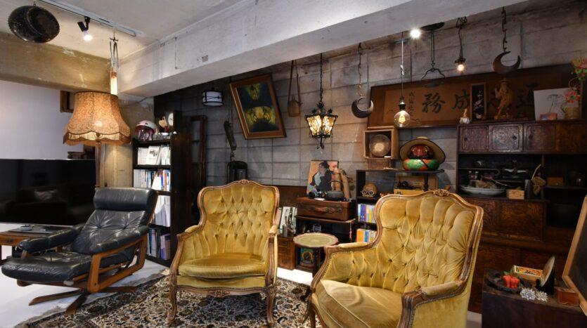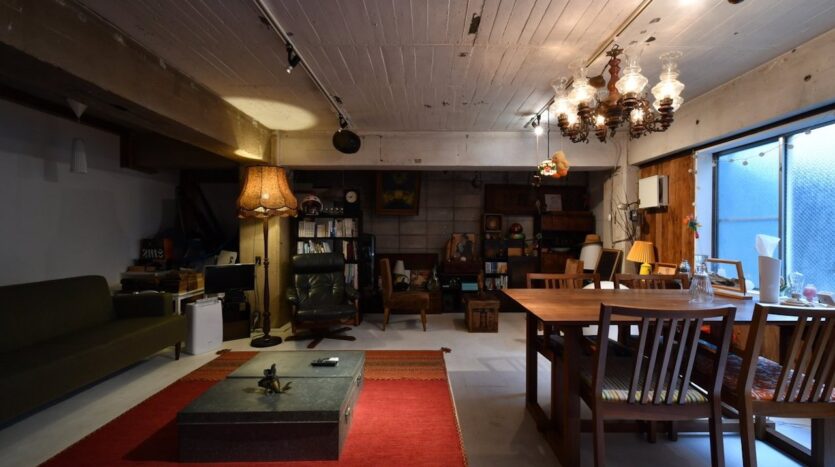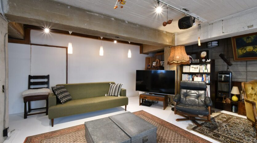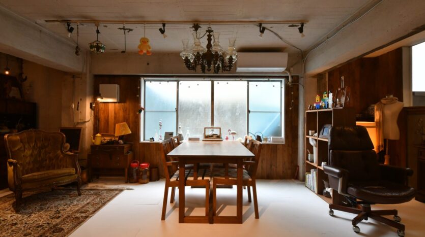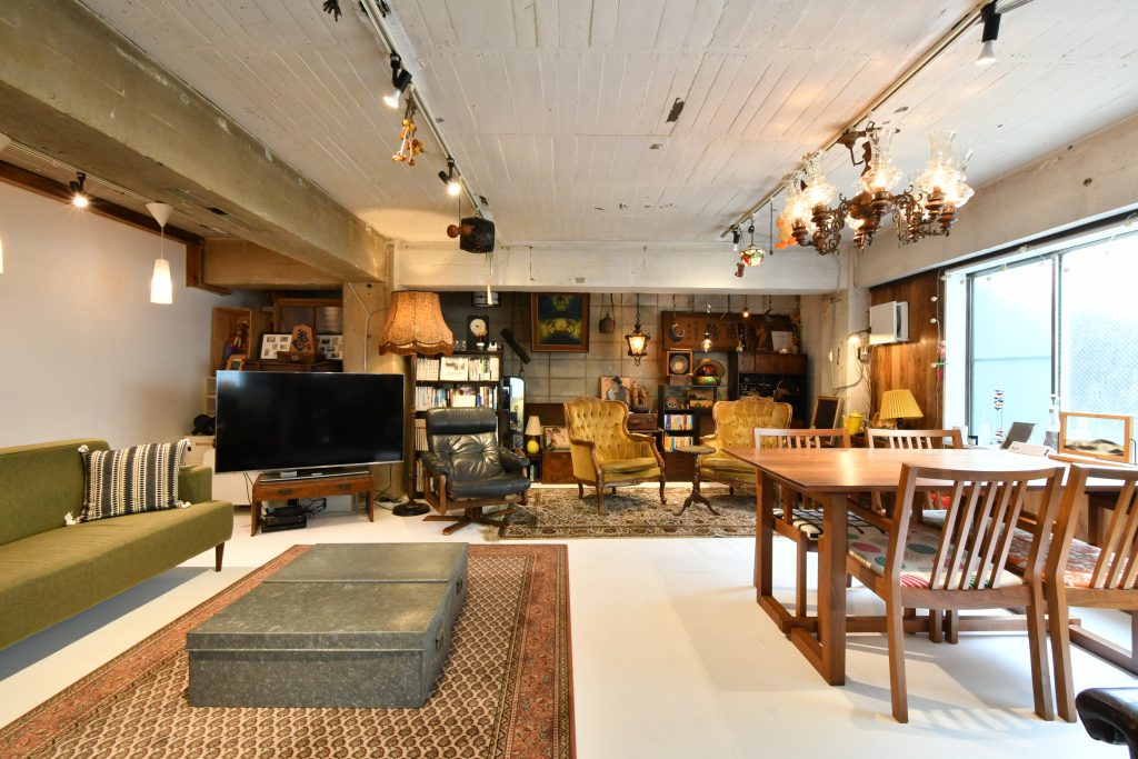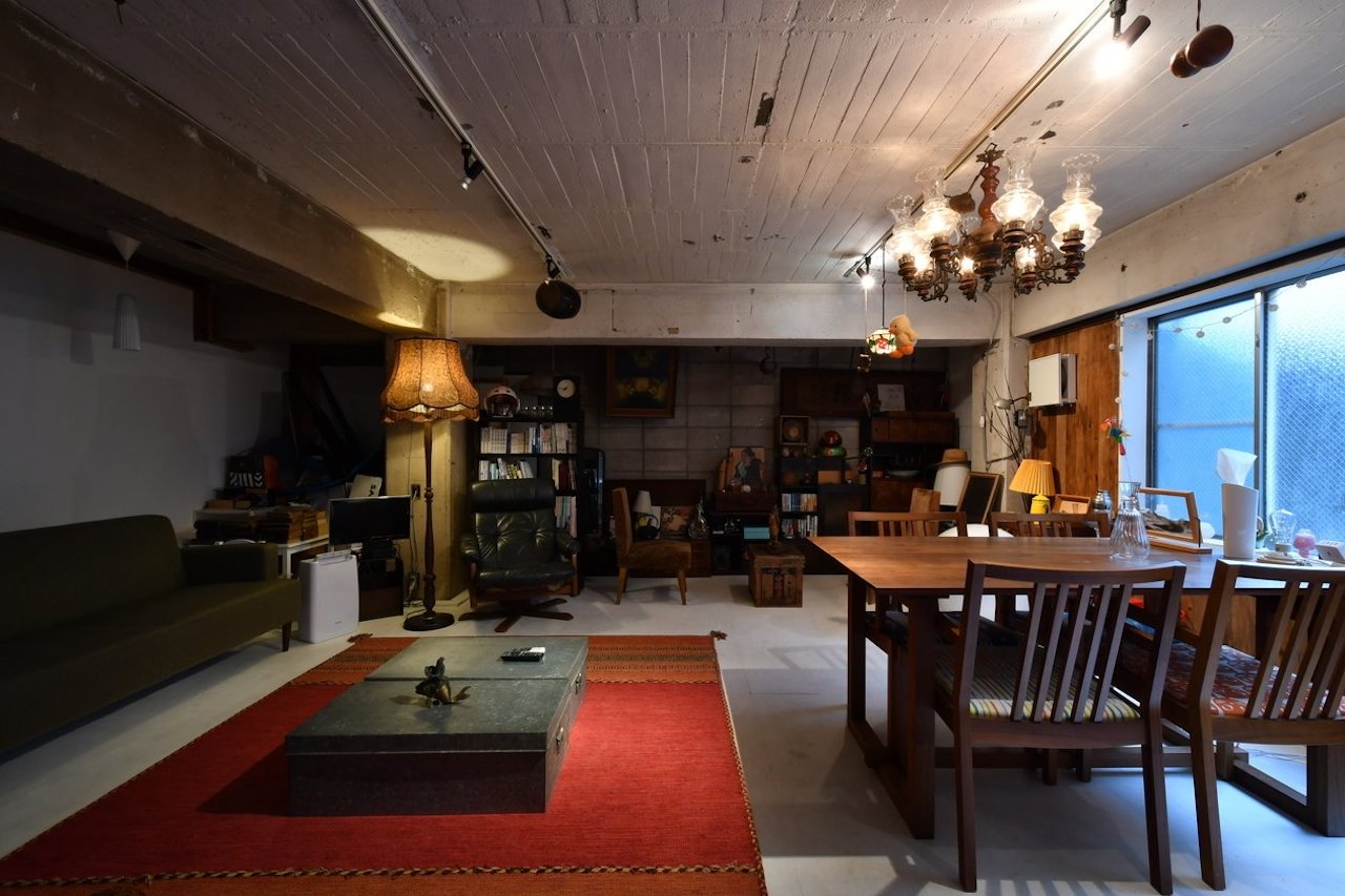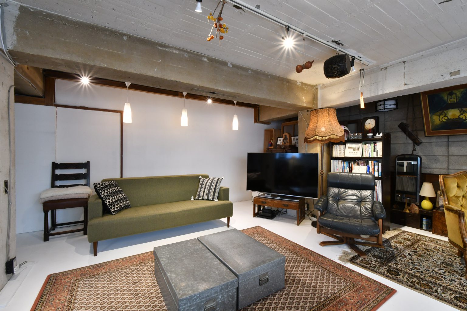 総面積69.3㎡の室内は、半地下にあり、直射日光は入らないため安定した光で撮影できるのが特徴。DIYした内装はコンクリートの梁や白壁、板張りの天井などでシンプルに。インテリアはシャンデリアや多数の間接照明、ヴィンテージ家具などでコーディネートして個性的な雰囲気を醸し出しています。