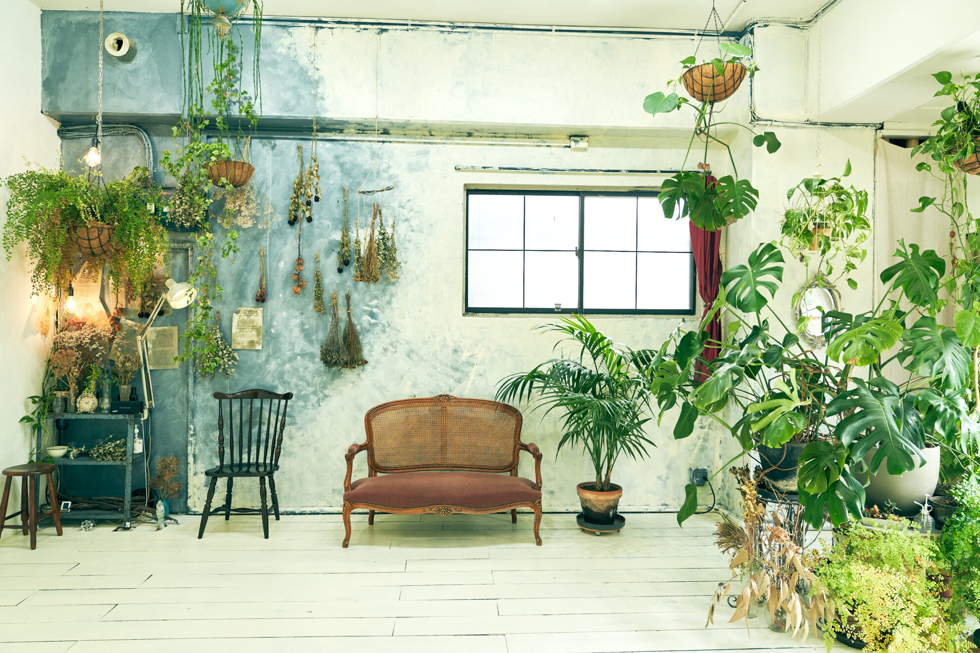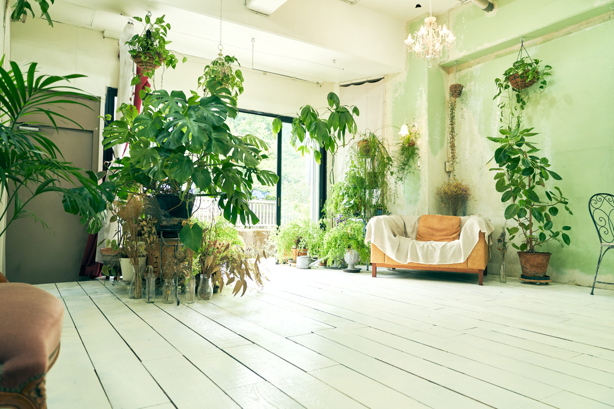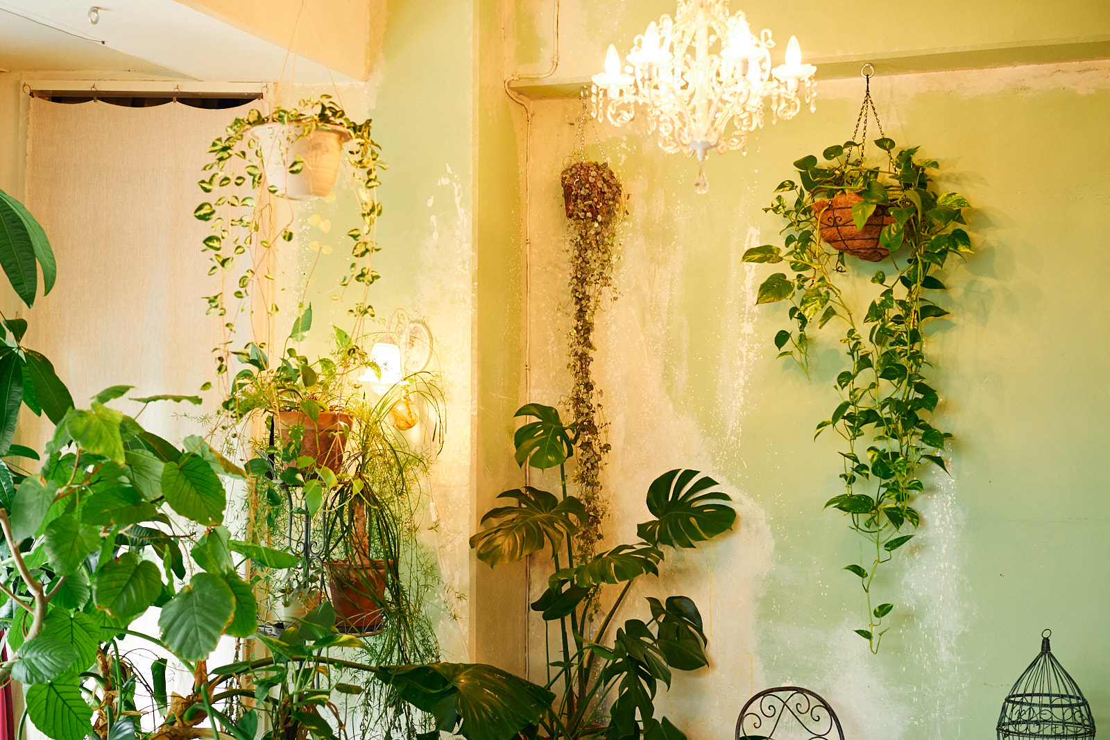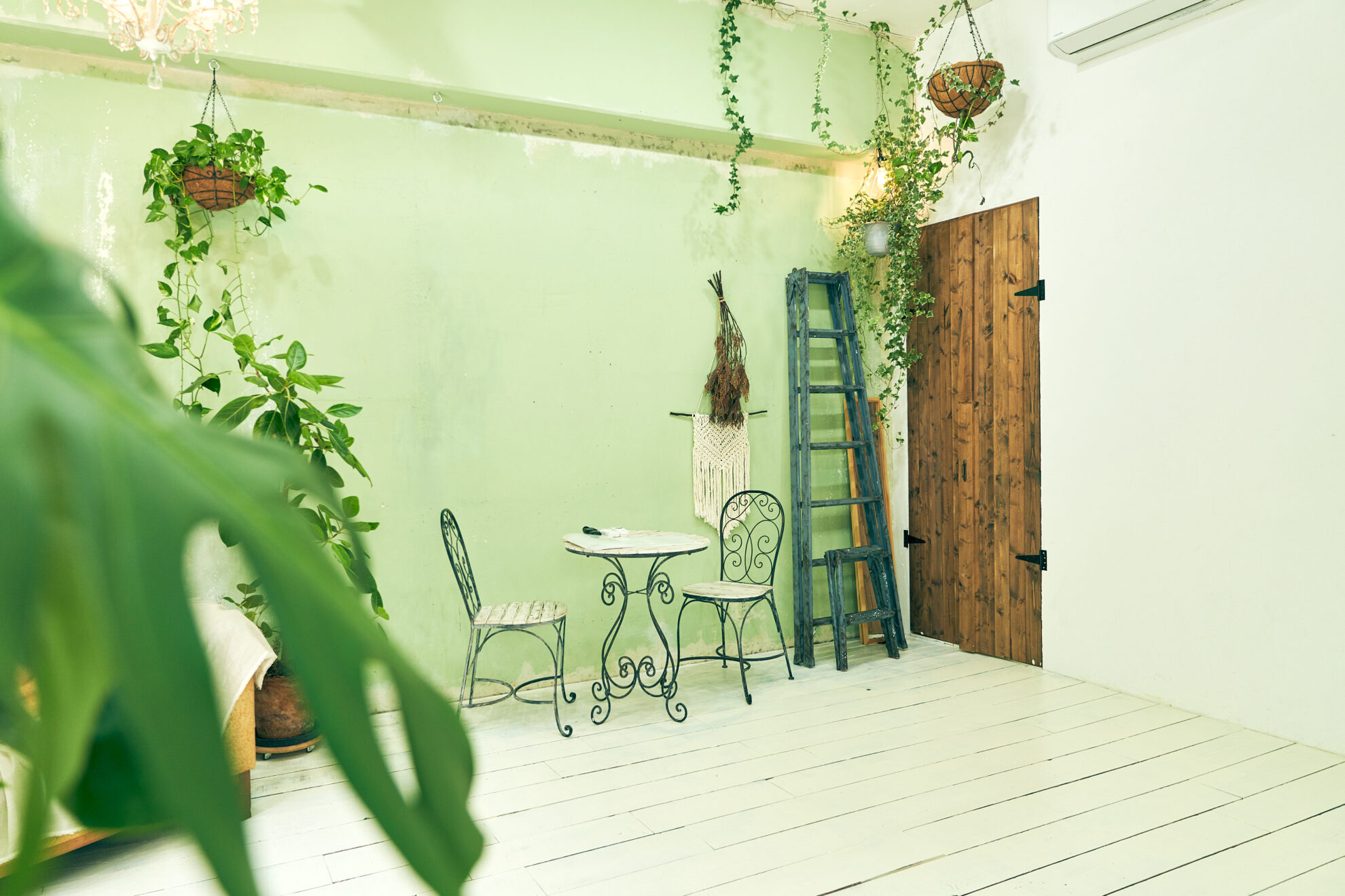 木のフローリング床や淡いグリーンの壁、木のドアなどの仕様や空間をみずみずしく彩るグリーンが、ガーリーでシックな空間を演出しています。
