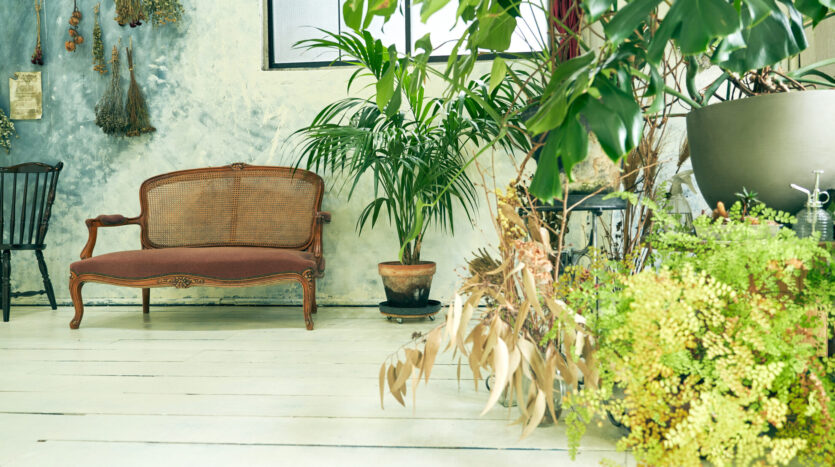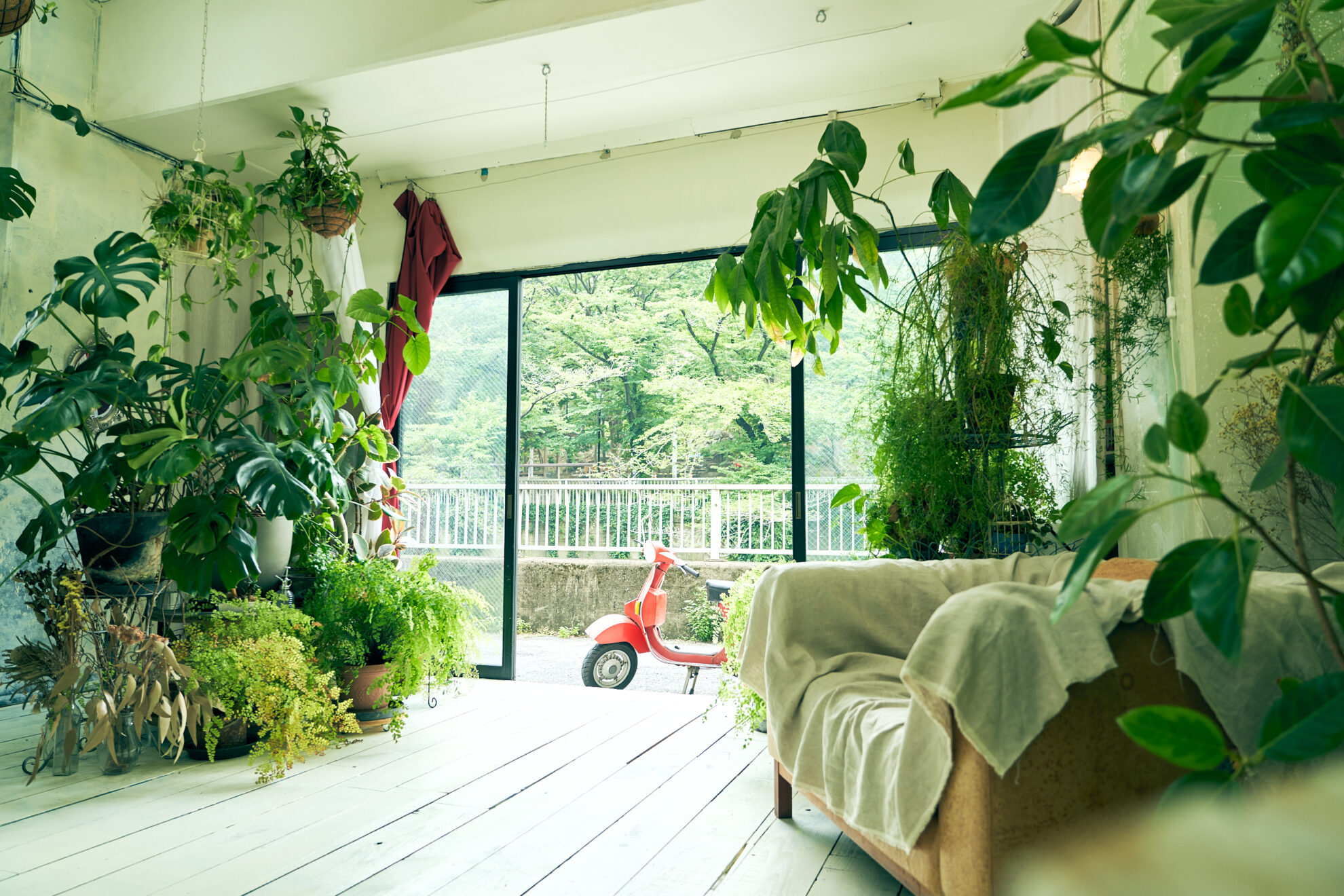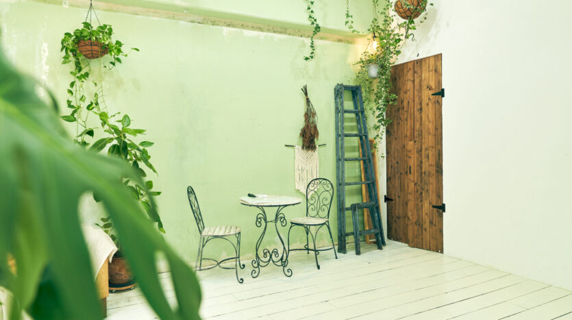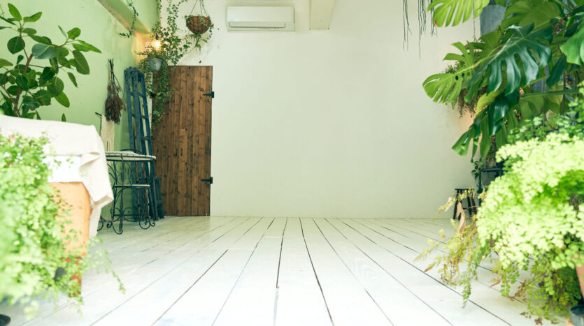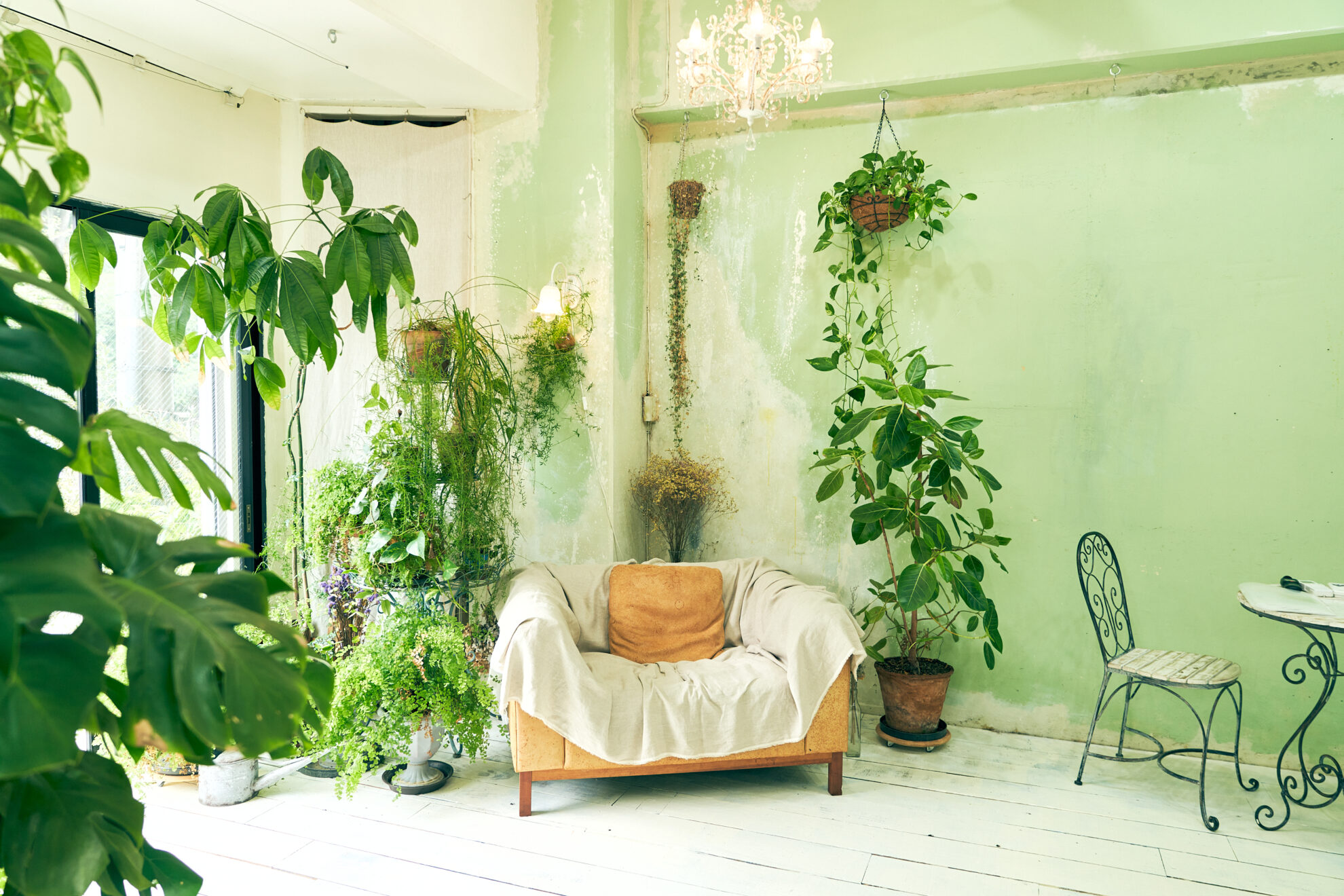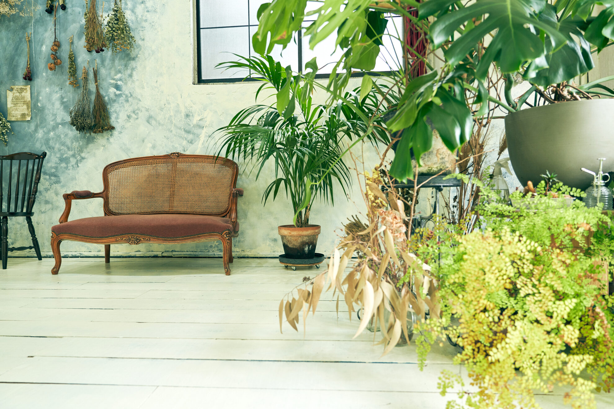 木のフローリング床や淡いグリーンの壁、木のドアなどの仕様や空間をみずみずしく彩るグリーンが、ガーリーでシックな空間を演出しています。