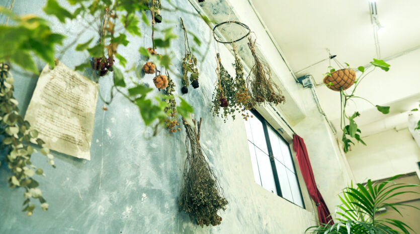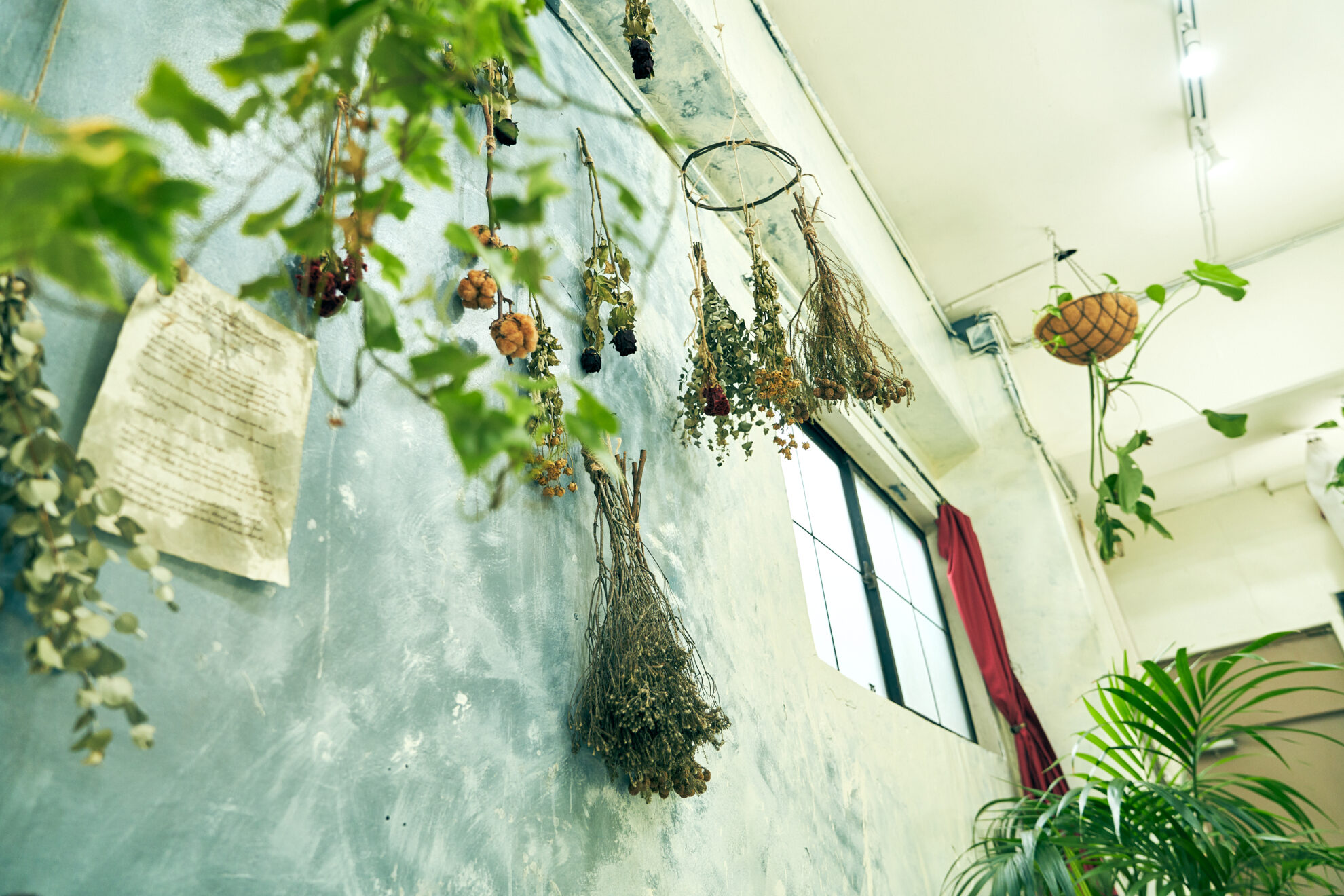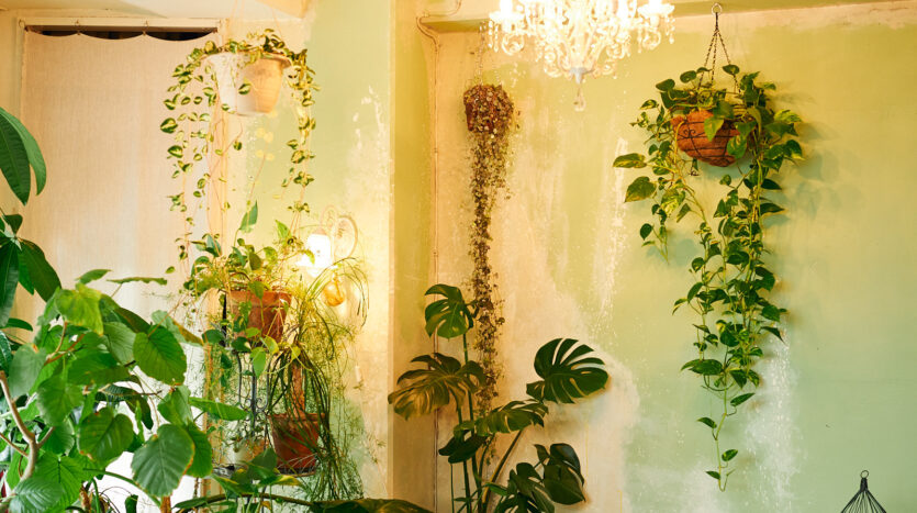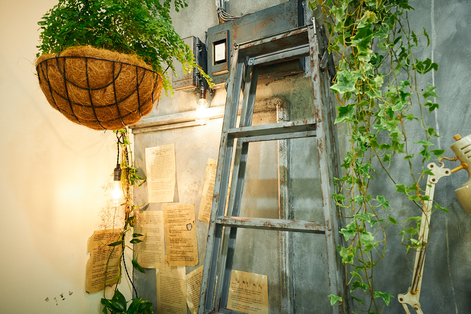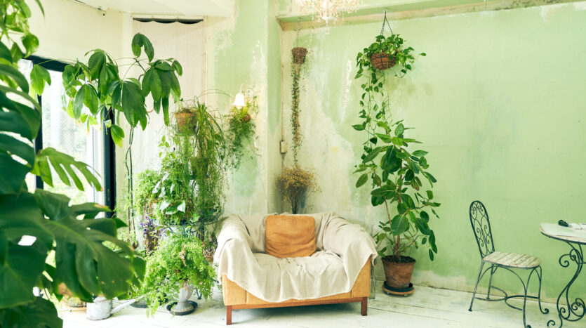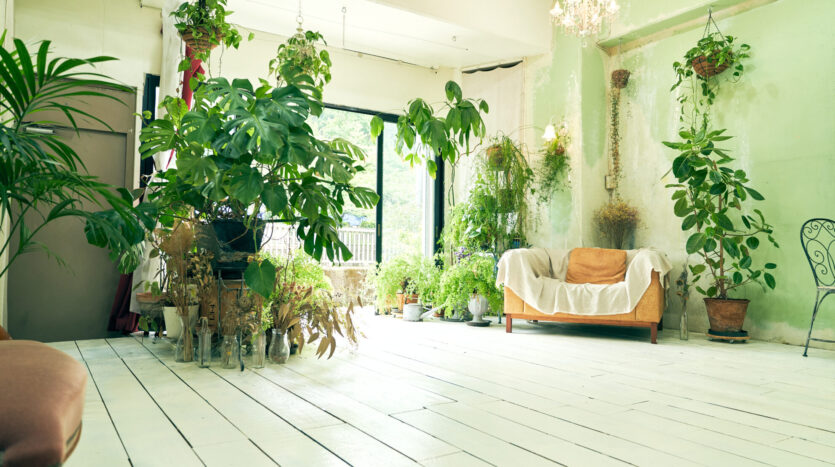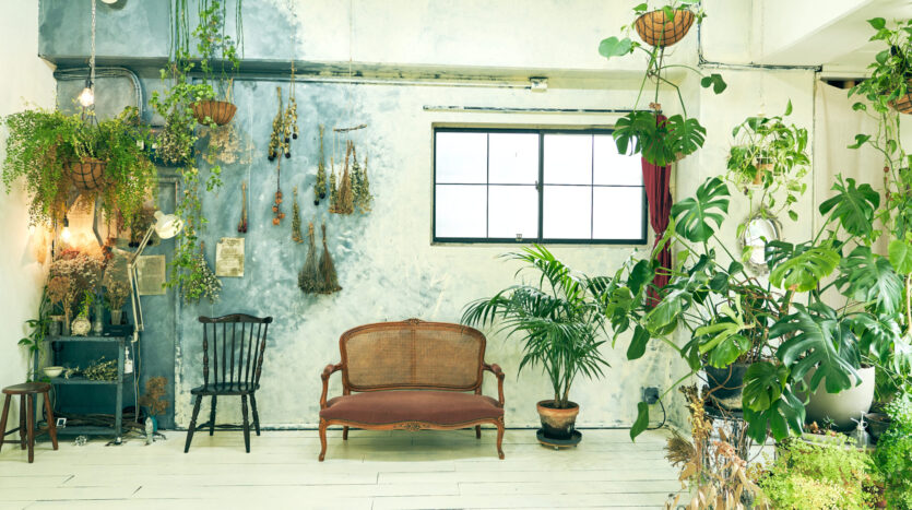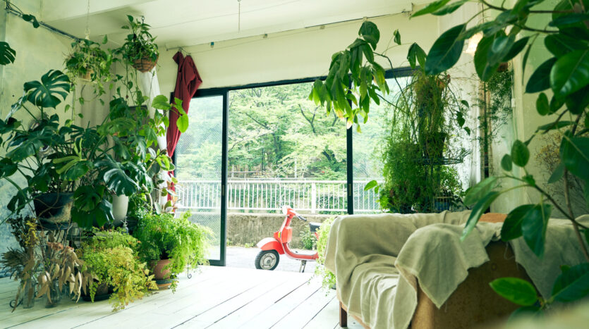 木のフローリング床や淡いグリーンの壁、木のドアなどの仕様や空間をみずみずしく彩るグリーンが、ガーリーでシックな空間を演出しています。