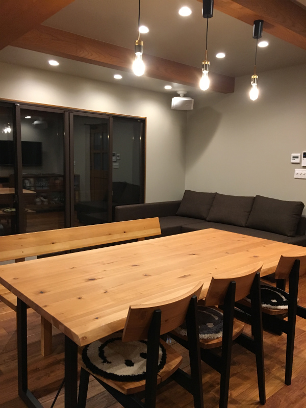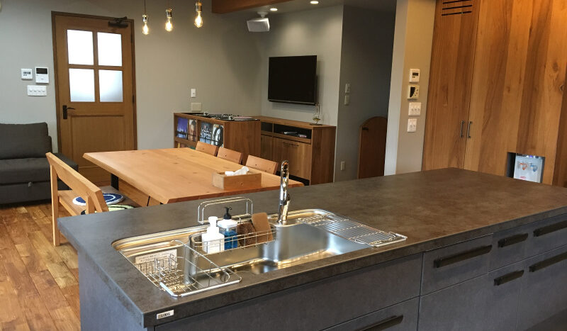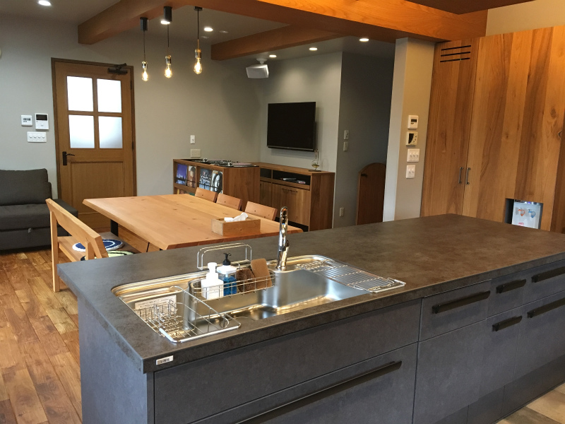 南側の大きな窓から自然光が差し込む明るい空間で、最新アイランドキッチンを設置したおしゃれで使い勝手のよいスペースです。