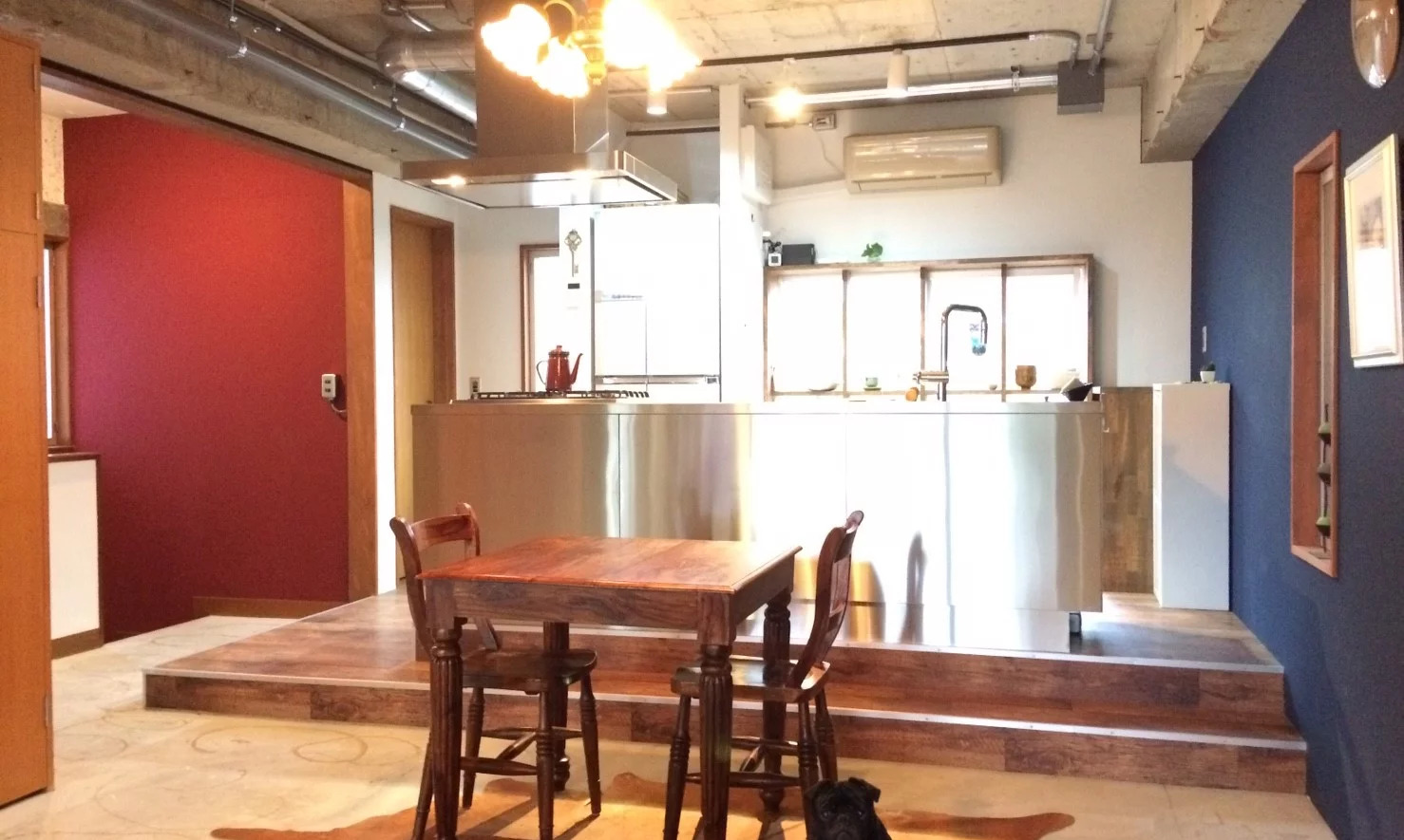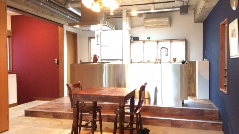 ステンレス製のアイランドキッチンを設置したキッチンスペースは、段差を設けたスキップフロアで壁面はアクセントクロスでおしゃれな雰囲気。リビングや階段、バスルームなどの壁面も、コンクリート打ちっぱなしでクールな印象を表現しています。