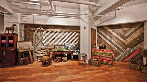 内装は、コーナーごとに異なる壁材を利用しているのが特徴で、使いやすい白壁をはじめ、パレットの古材を張り巡らせた壁面やアンティークドアを並べた壁など、レイアウト次第で様々なテイストを演出することが可能です。