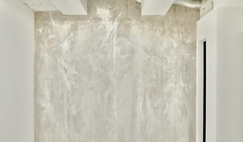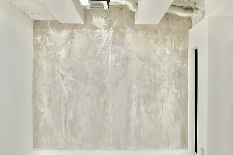 このスタジオのこだわりは、オリジナルに塗装した壁。古い壁紙をランダムにはがし、舘山で採取した土などを用いてペイントや左官を重ねた独特の風合いを醸し出しています。