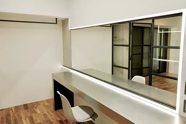 メイクルームは現役ヘアメイクがプロデュースしており、照明の色から鏡の位置、テーブル、水道空間など、プロならではの目線で設計した使い勝手がよくシンプルな空間です。