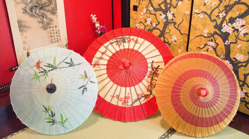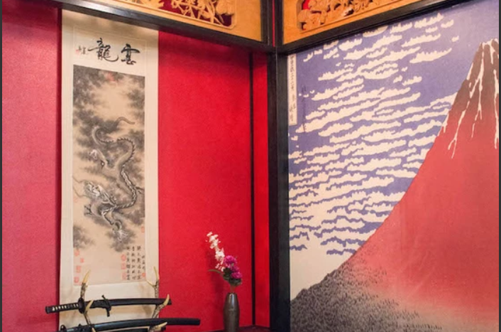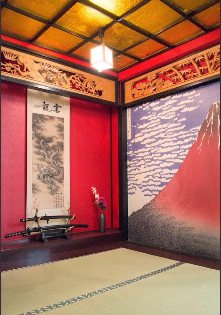 松竹梅の欄間や黄金の天井など、豪華絢爛なしつらえが目を引く和室。赤富士の壁面は、ふすまに変更することもできます。ふすまは片面が桜、もう片面は孔雀を描いたリバーシブル仕様なので、背景のバリエーションを増やせるのがポイントです。掛け軸も3種類揃えており、好みで選べます。