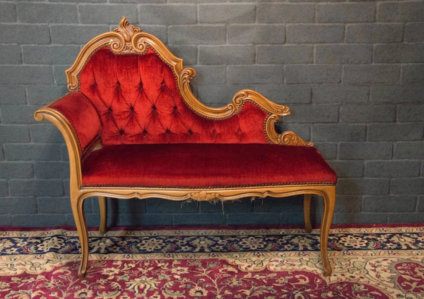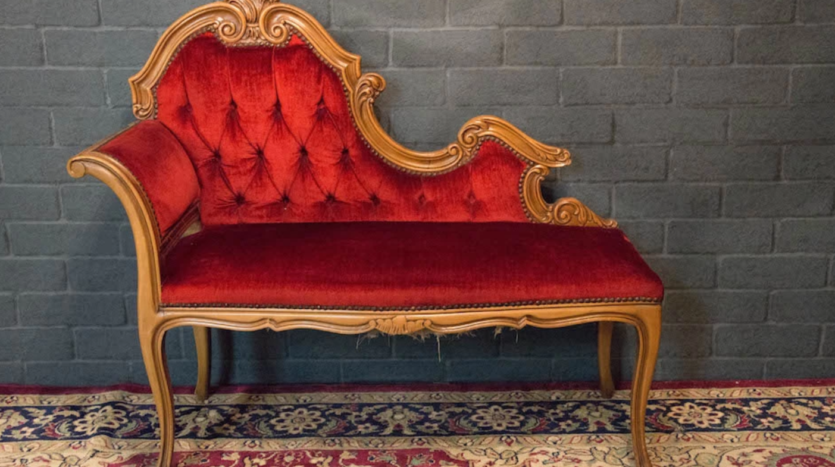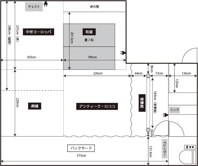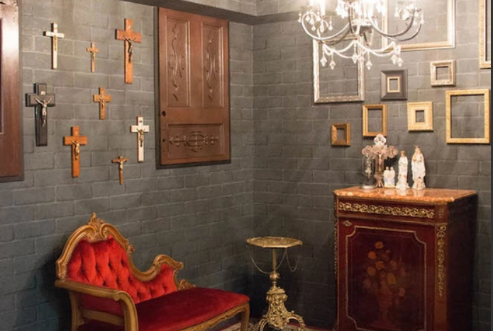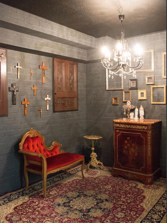 壁面に十字架と額縁でゴシック調の雰囲気を演出しています。ソファやチェスト、テーブルなどの家具は移動可能、赤い絨毯も取り外しできるので、お好みのレイアウトに変更できます。