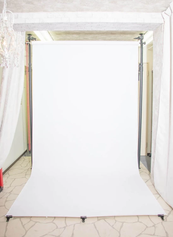 有料の白背景は幅1.8mで3名程度なら並んで撮影可能で、人物を切り抜きで使う場合などに役立ちます。利用希望の場合は予約時に申し込みが必要です。