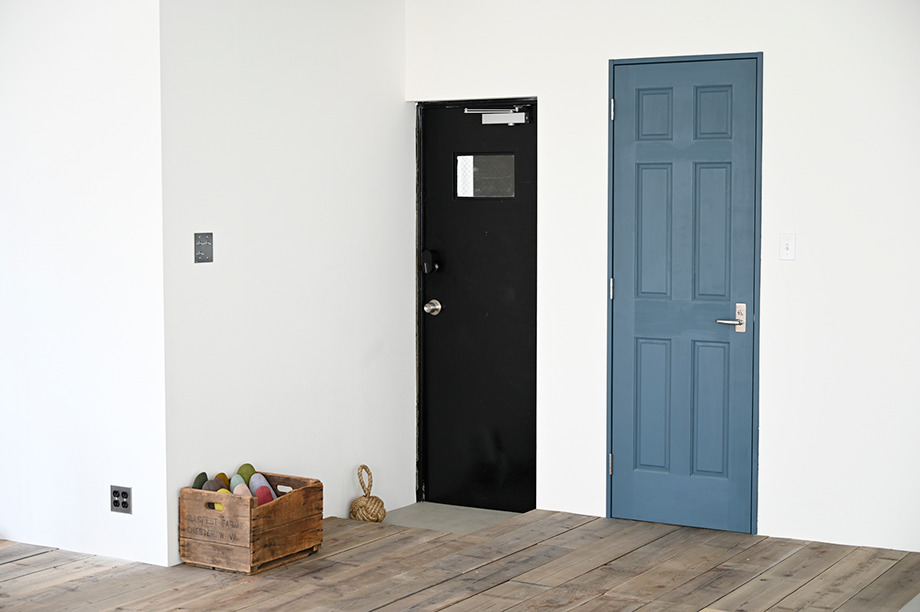 半分はシンプルなモルタル床の落ち着いた空間で、午前中に日差しが入ります。もう半分のウッドスペースは午後の採光を確保でき、杉古材を使ったナチュラルな内装が特徴です。