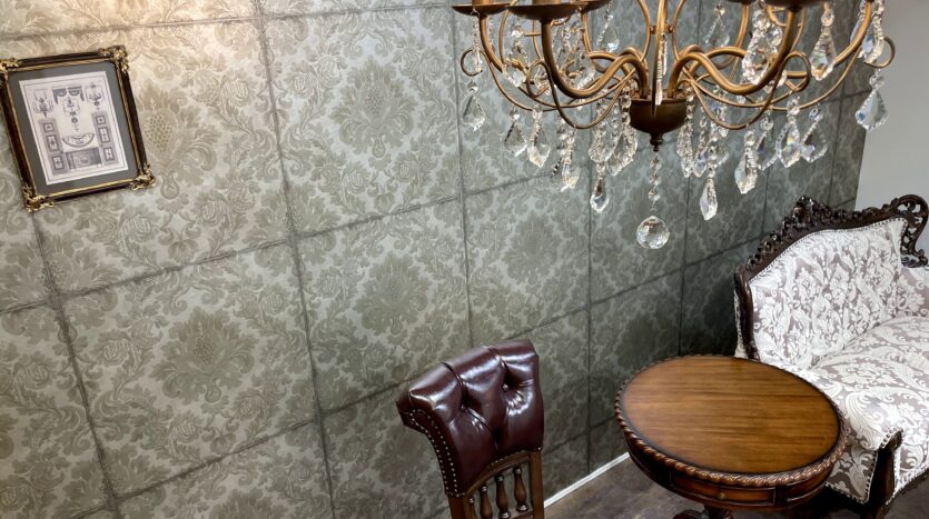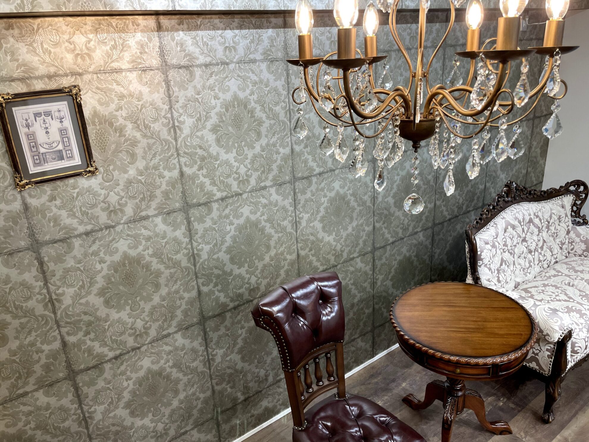 木目調の空間はソファーやシャンデリアなどのインテリアにこだわった、エレガントな雰囲気となっています。