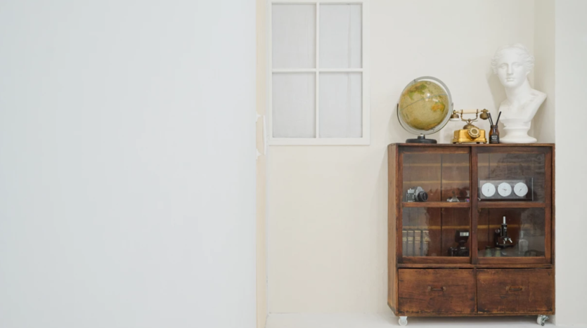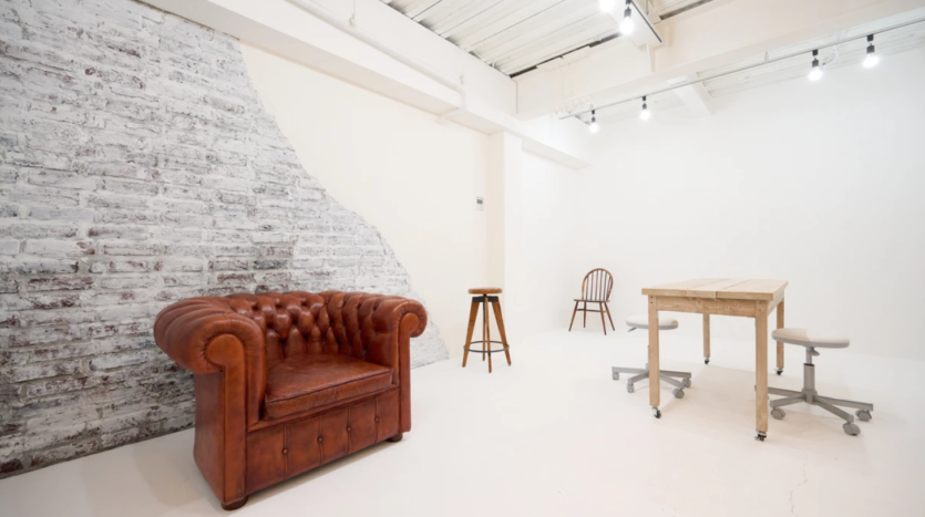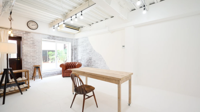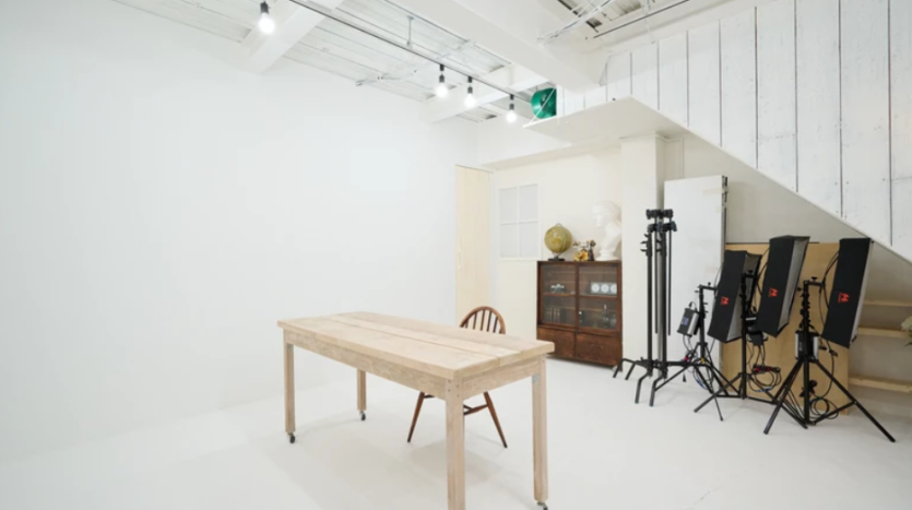スタジオ内は白とグレーを基調にしたシンプルな内装で、大きな窓から自然光が差し込む明るい空間です。インダストリアルテイストの家具やアンティーク小物などの家具や小道具は無料で利用でき、落ち着いた雰囲気の演出に役立ちます。
