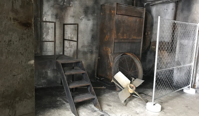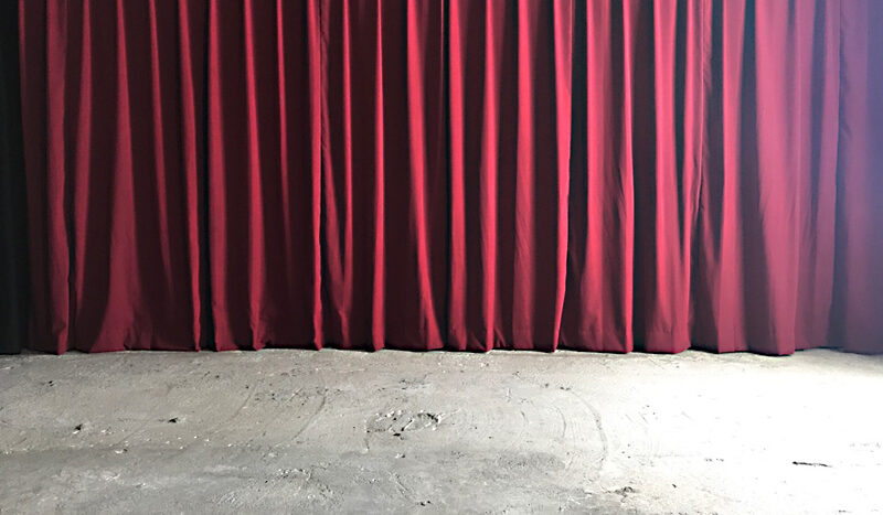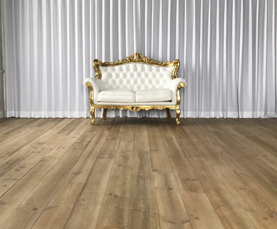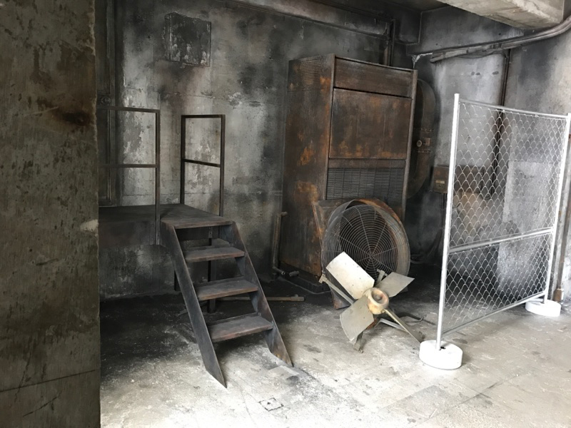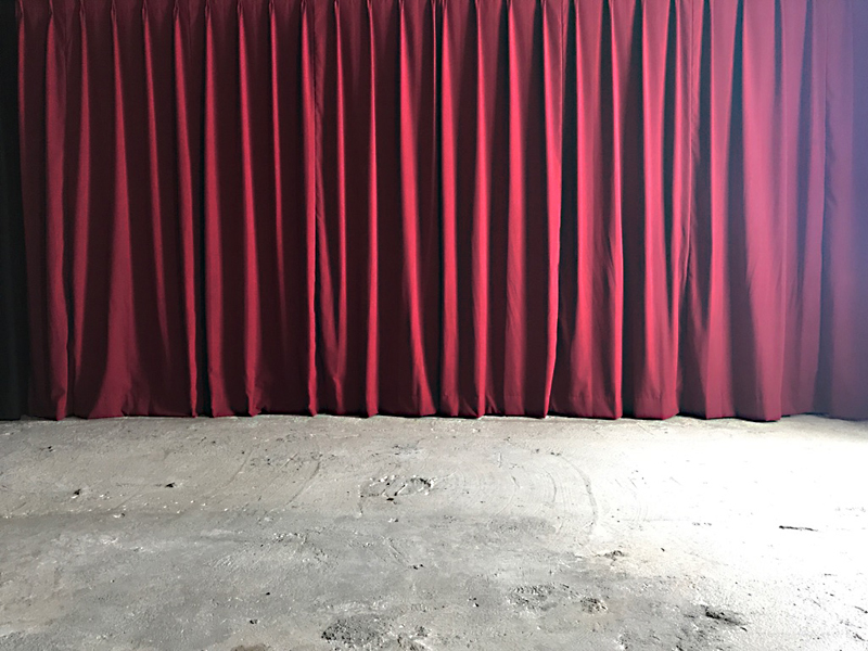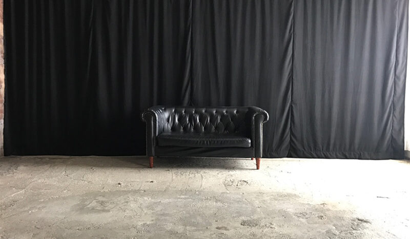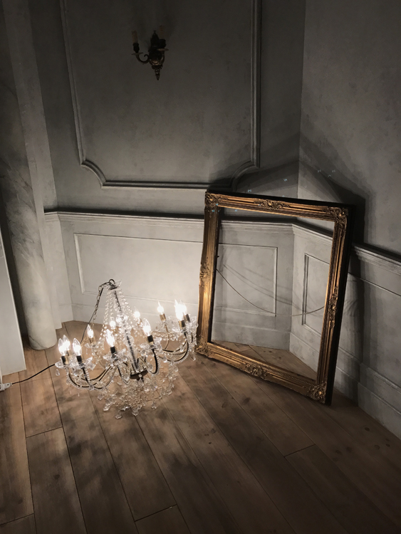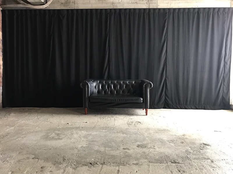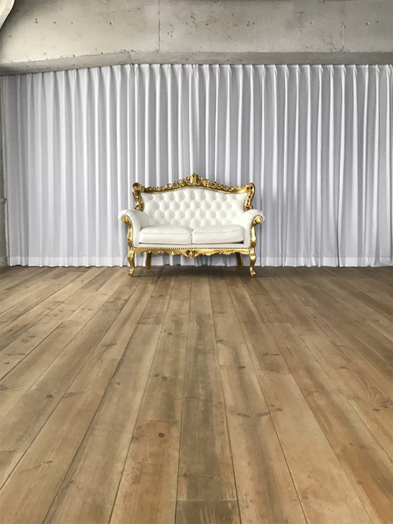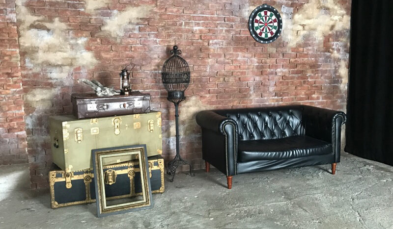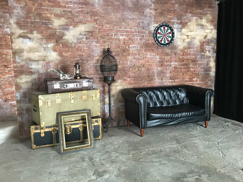 コンクリート床に、レンガ壁やユーズド感のあるコンクリート壁など荒廃した雰囲気のエリア。赤や黒のカーテンの背景に、ソファーを設置するのもおすすめです。船トランクや木箱などヴィンテージ風に演出できる小道具も揃っています。