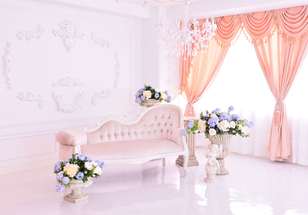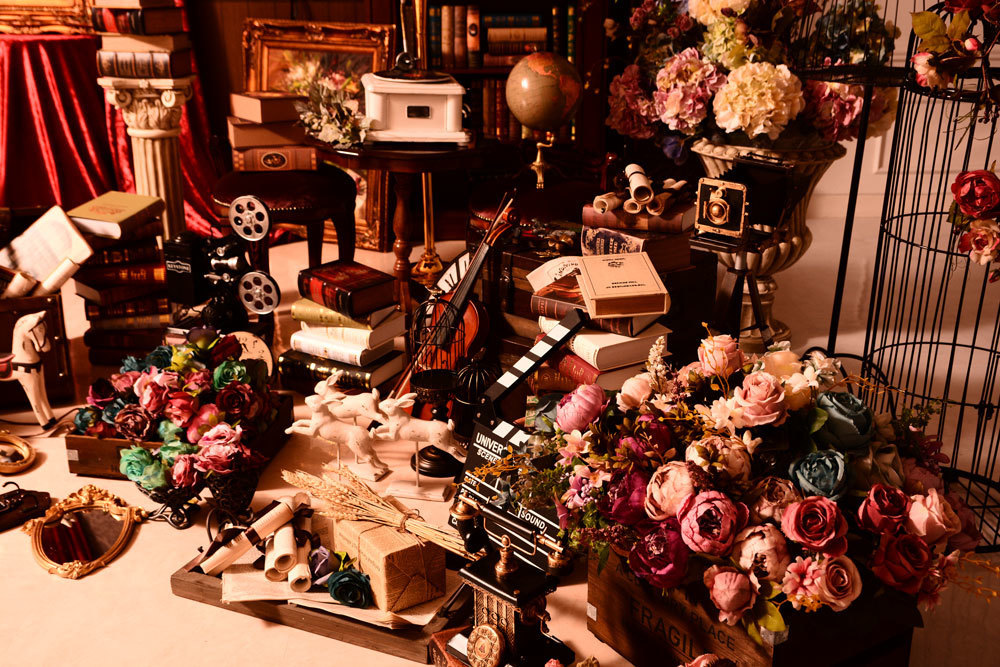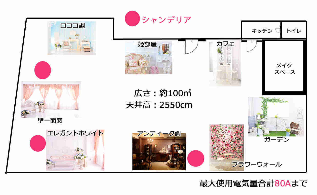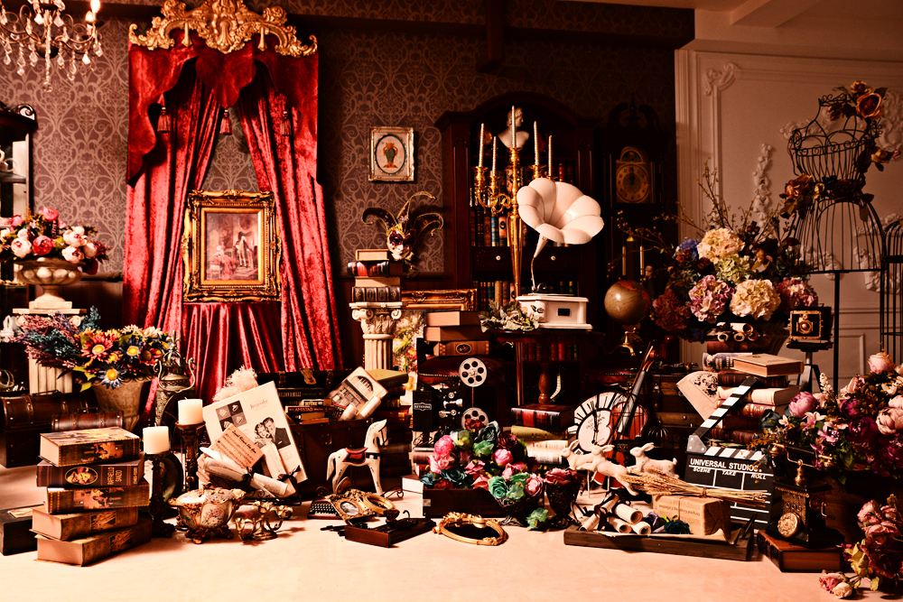 長方形のスタジオ内にはロココ調、アンティーク調、姫系、カフェ風、ガーデン、フラワーウォールなど様々な撮影スペースがあり、それぞれのシーンには家具や、什器を多数配置しています。