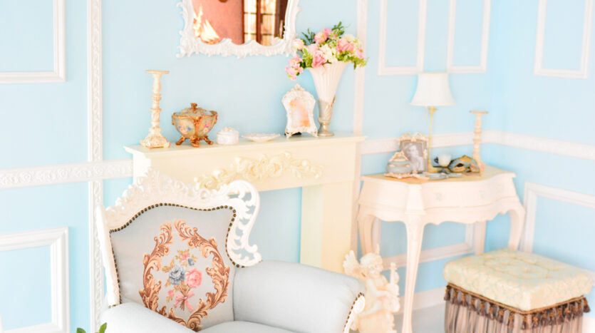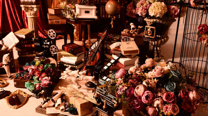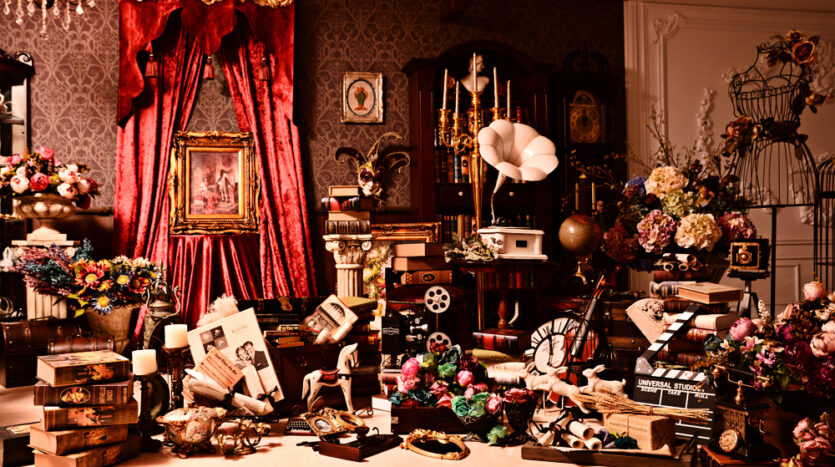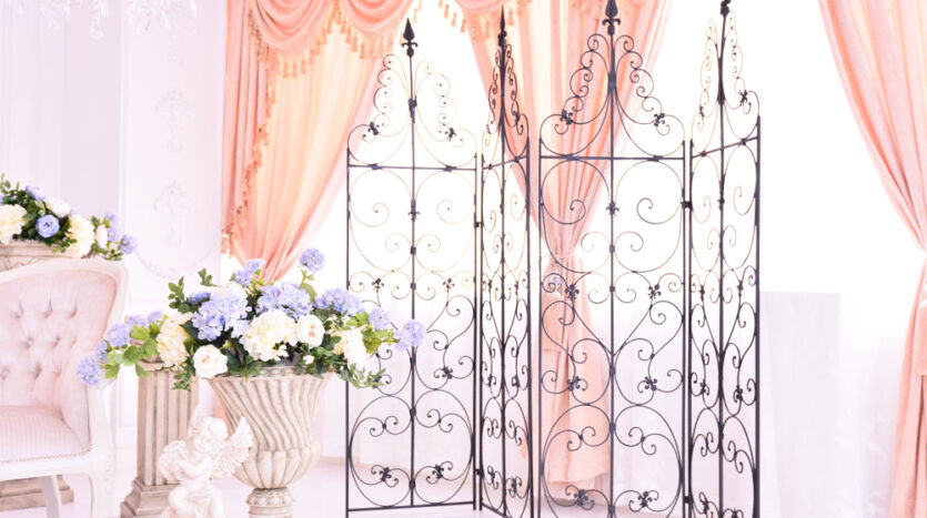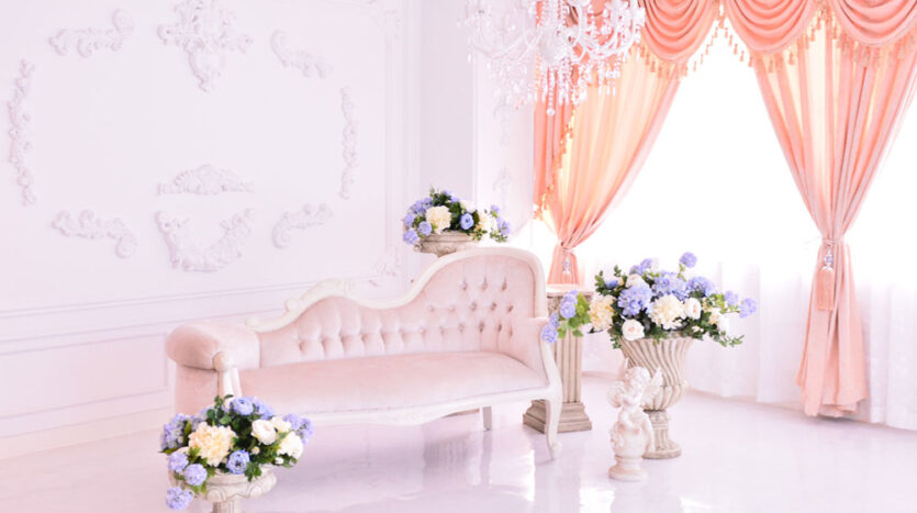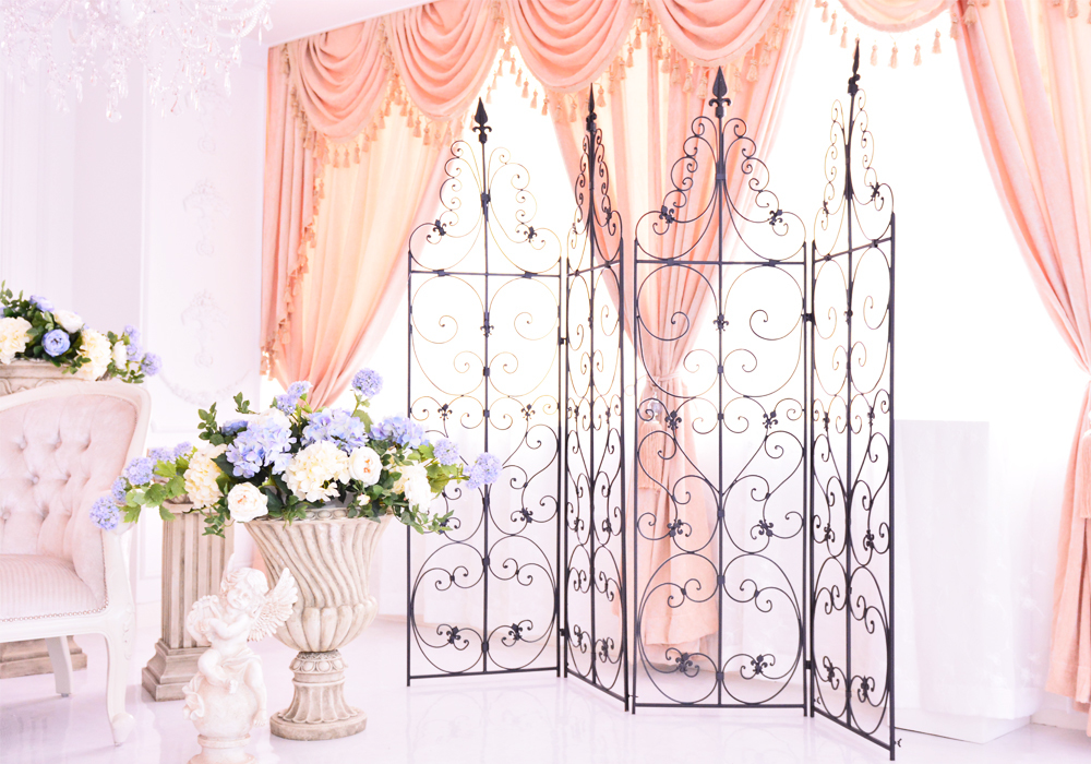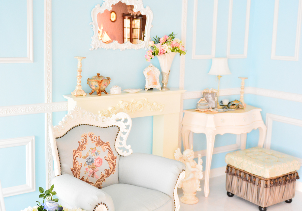 長方形のスタジオ内にはロココ調、アンティーク調、姫系、カフェ風、ガーデン、フラワーウォールなど様々な撮影スペースがあり、それぞれのシーンには家具や、什器を多数配置しています。