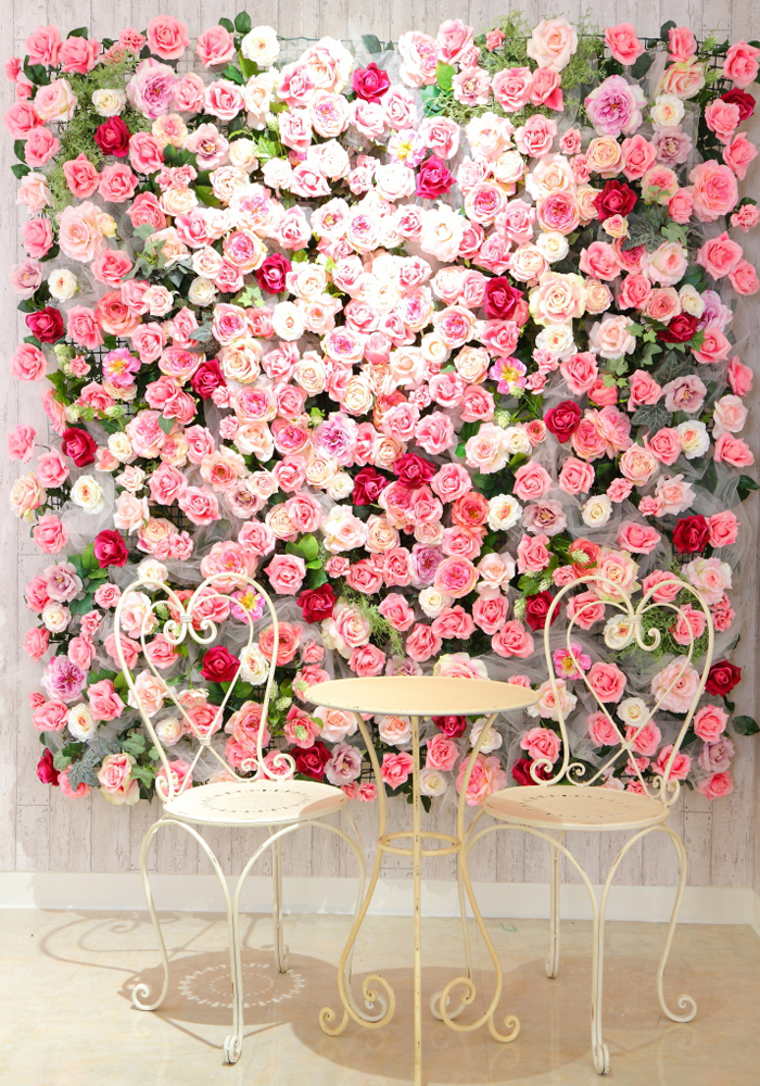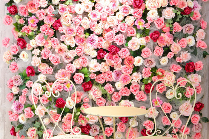 壁一面窓のスペースもあり、特注のカーテンとシャンデリアを設置。晴れの日の午前中は自然光撮影もでき、ドレス撮影やウェディング撮影に最適です。フラワーウォールスペースは壁一面に本物の造花を使用しているので、リアリティある立体的な撮影が可能です。