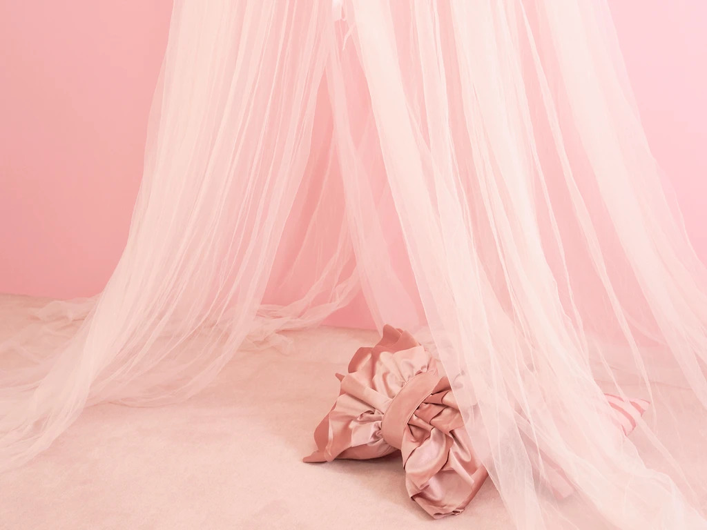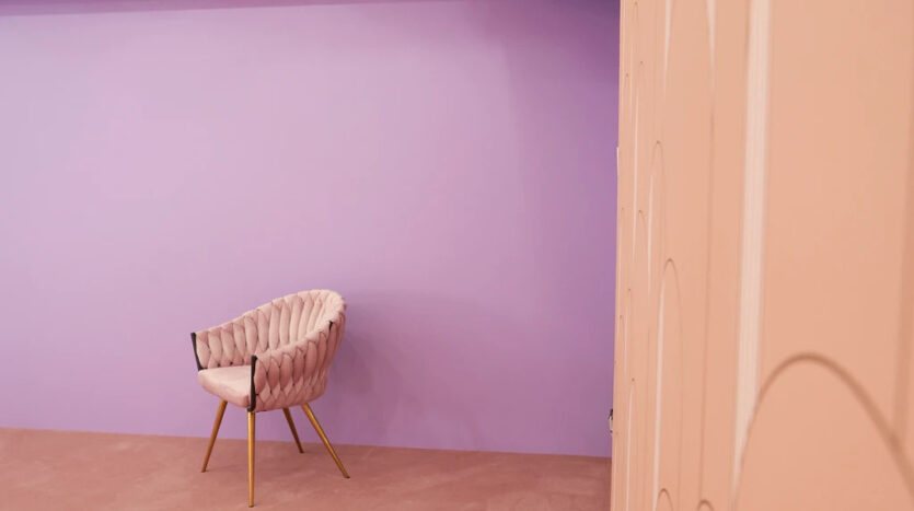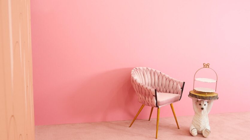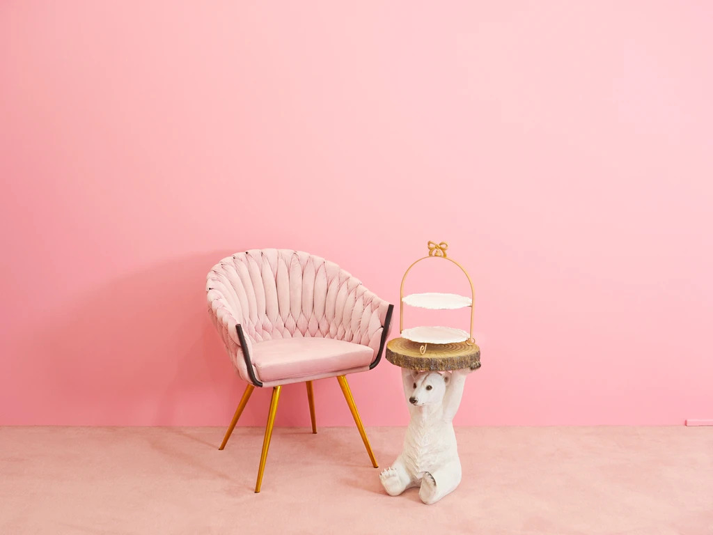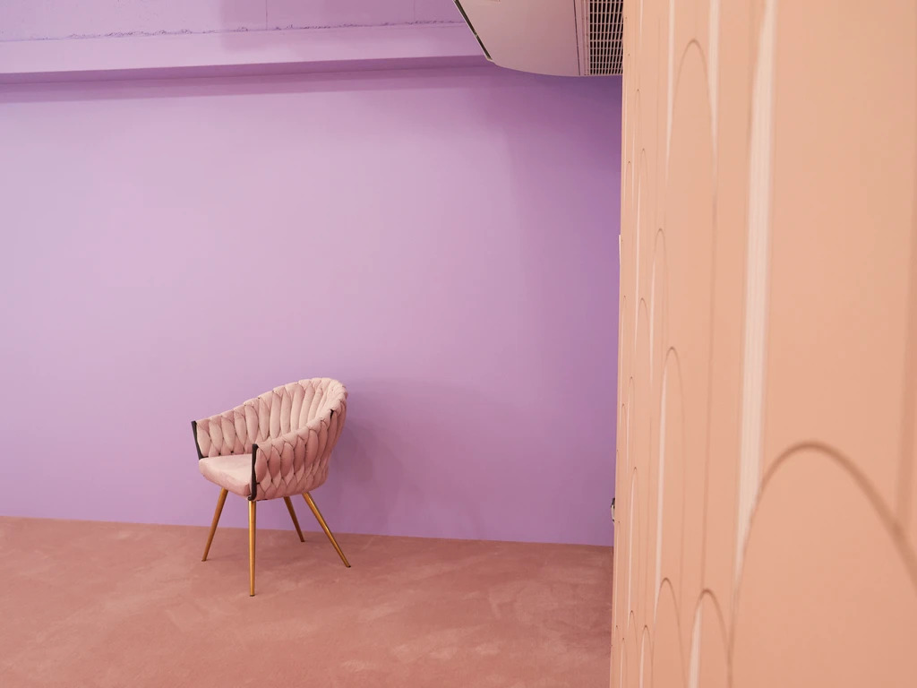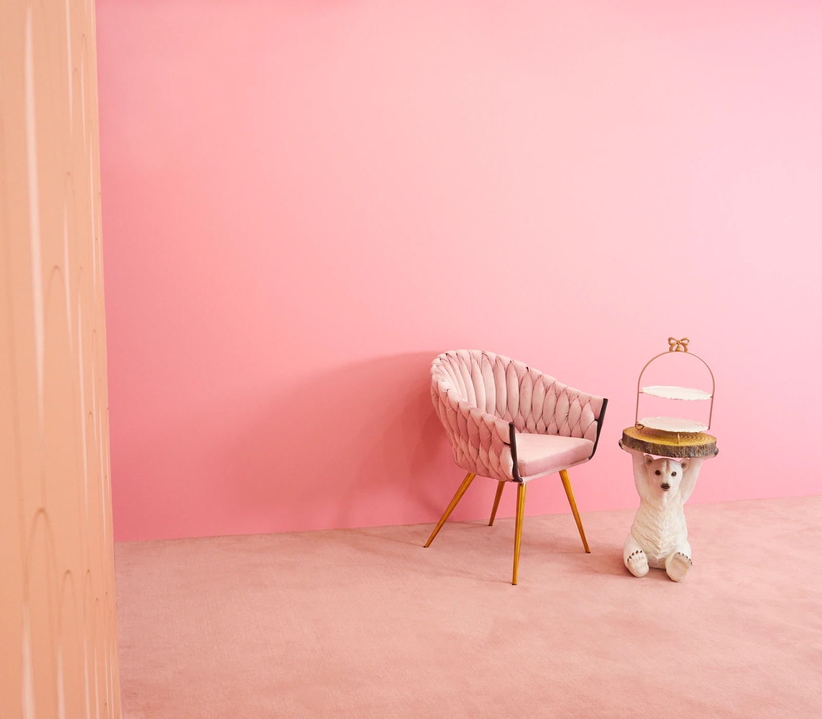 一面はピンクの壁とふかふかのピンクの絨毯を組み合わせた幅3.5mのコーナーで、壁面にはマットな塗装を施しています。キュートな家具や小道具を添えて、ガーリーな印象を演出できるスペースです。