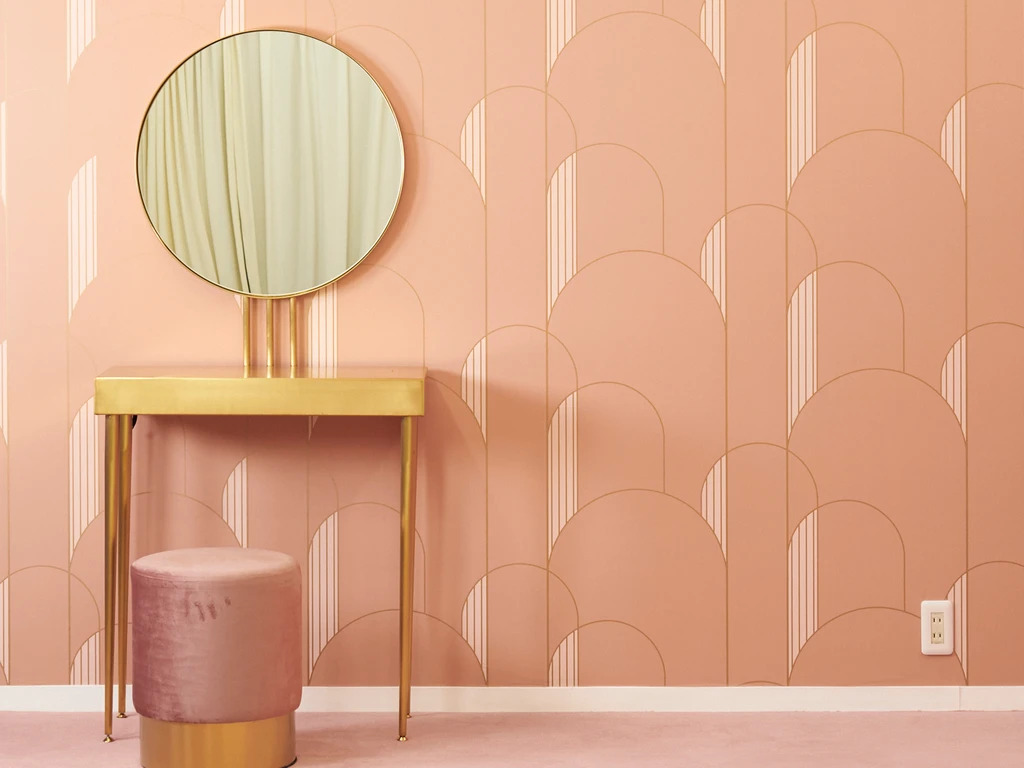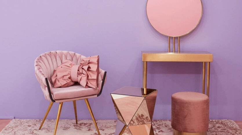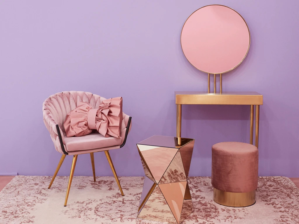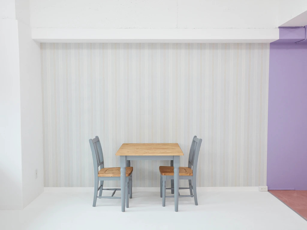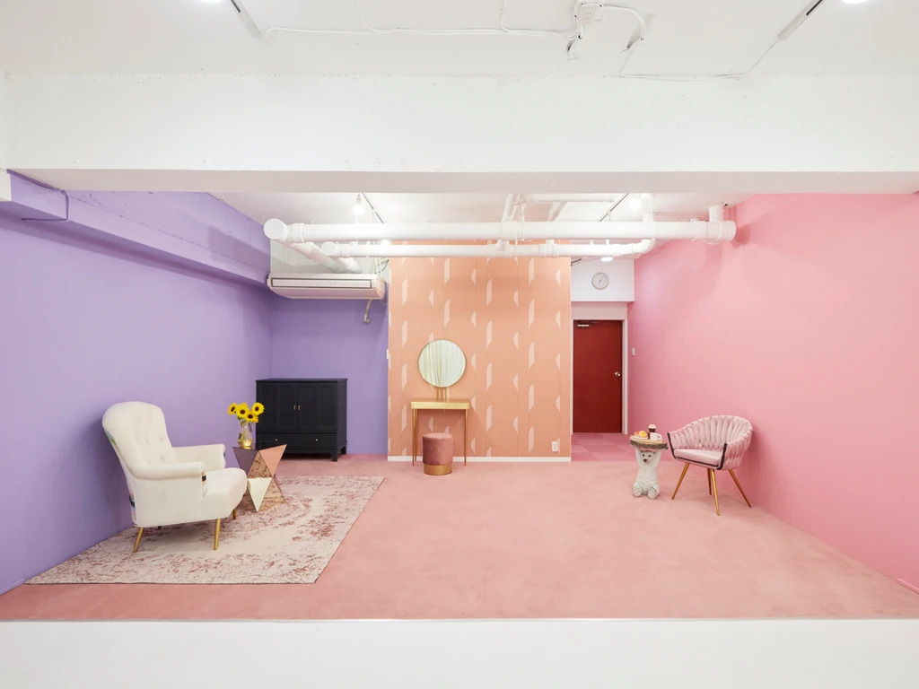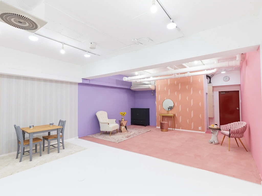 スタイリッシュな雰囲気で撮影するならば、幾何学模様の壁紙やパープル×ピンクの壁床のセットがおすすめ。ラグジュアリーテイストやフレンチカントリーな家具なども揃っており、写真映えすることうけあいです。