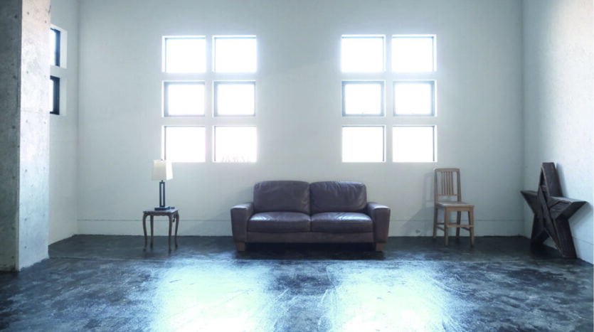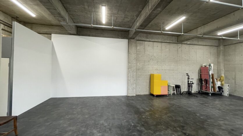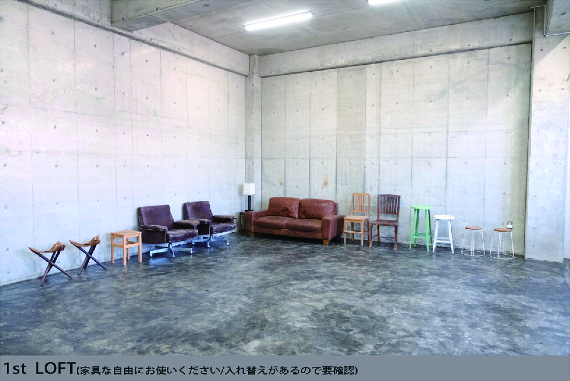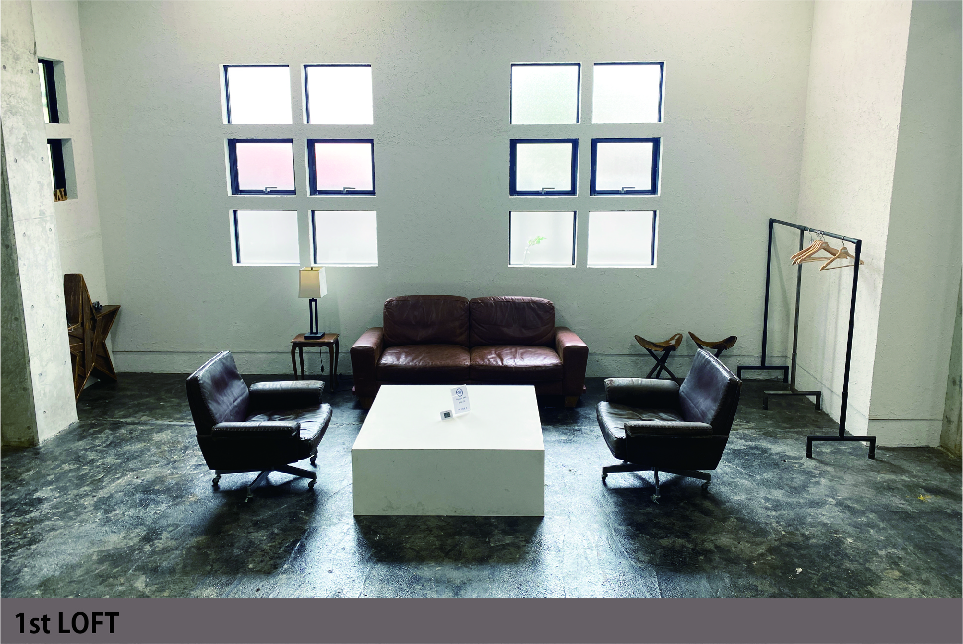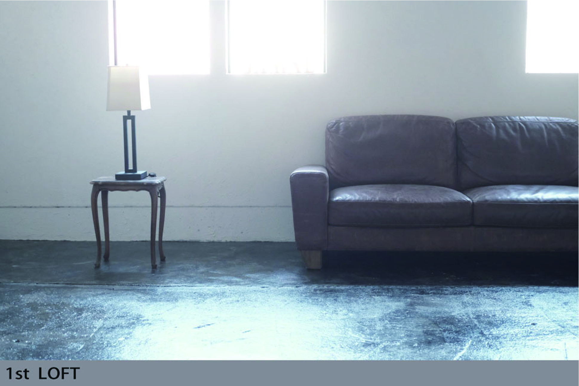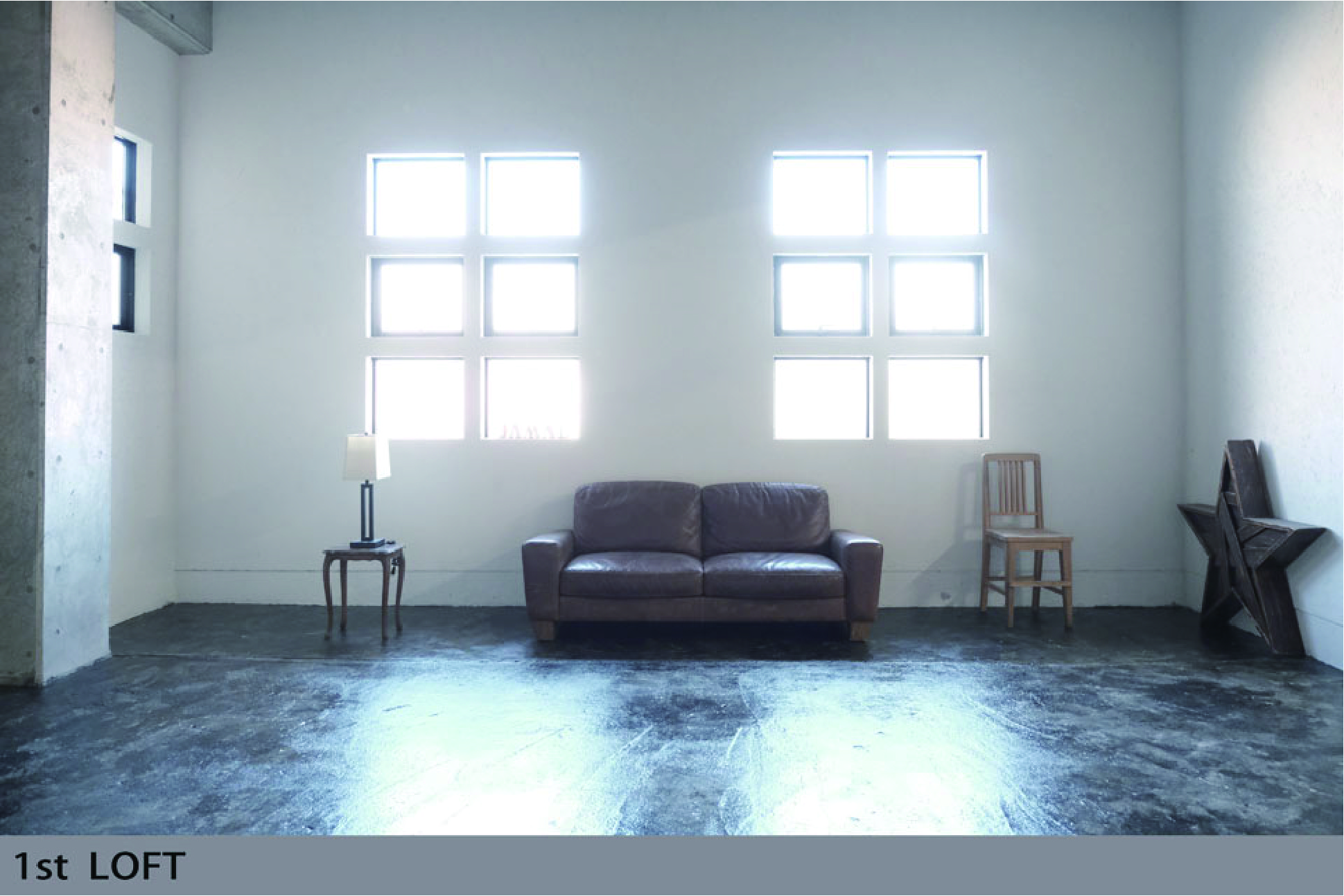 「1st LOFT」は天井高約4mの倉庫風スタジオ。コンクリ壁と黒塗り床にモダンな家具でまとめられたインダストリアルでスタイリッシュなイメージの空間です。