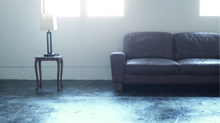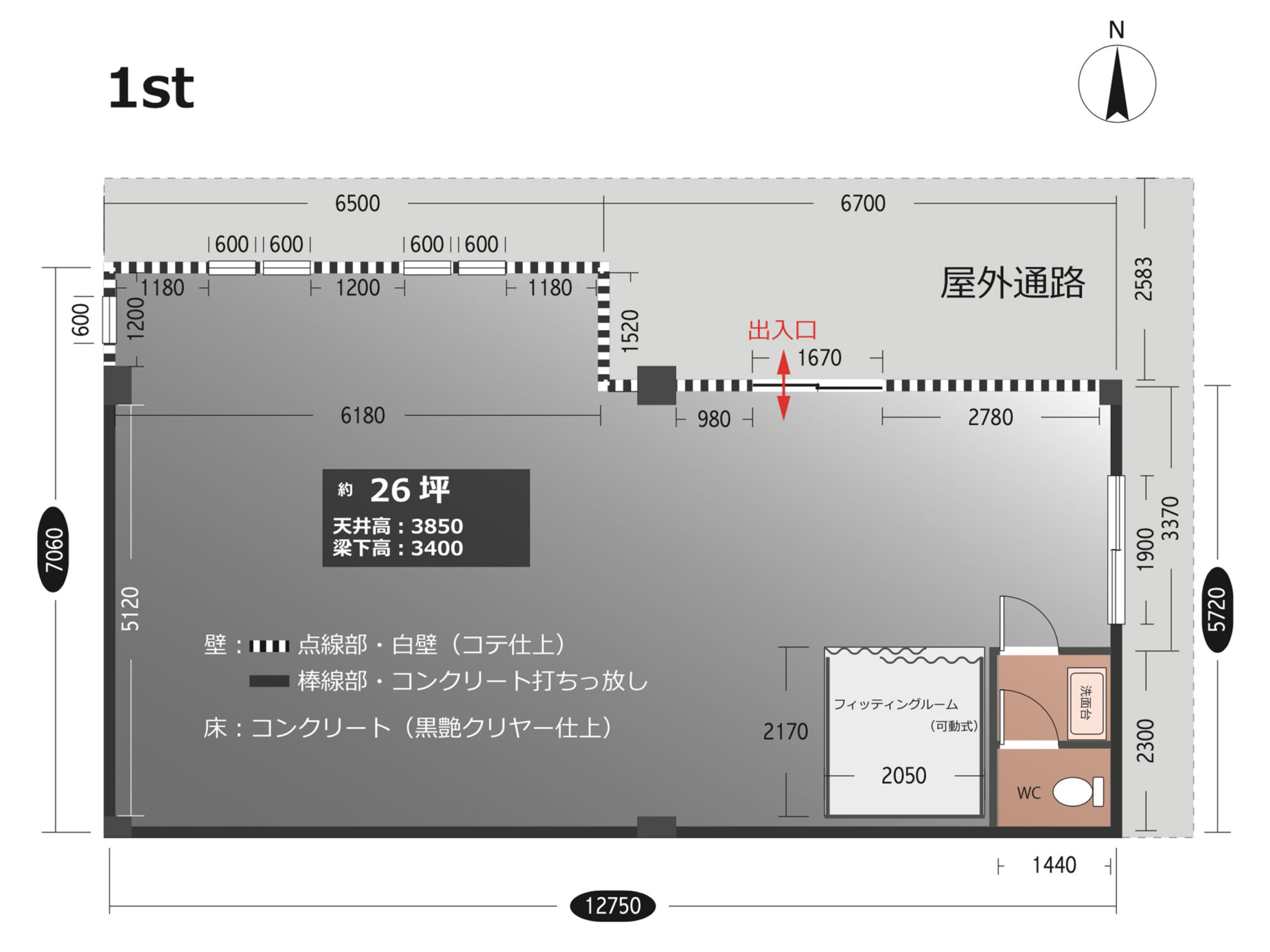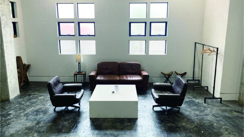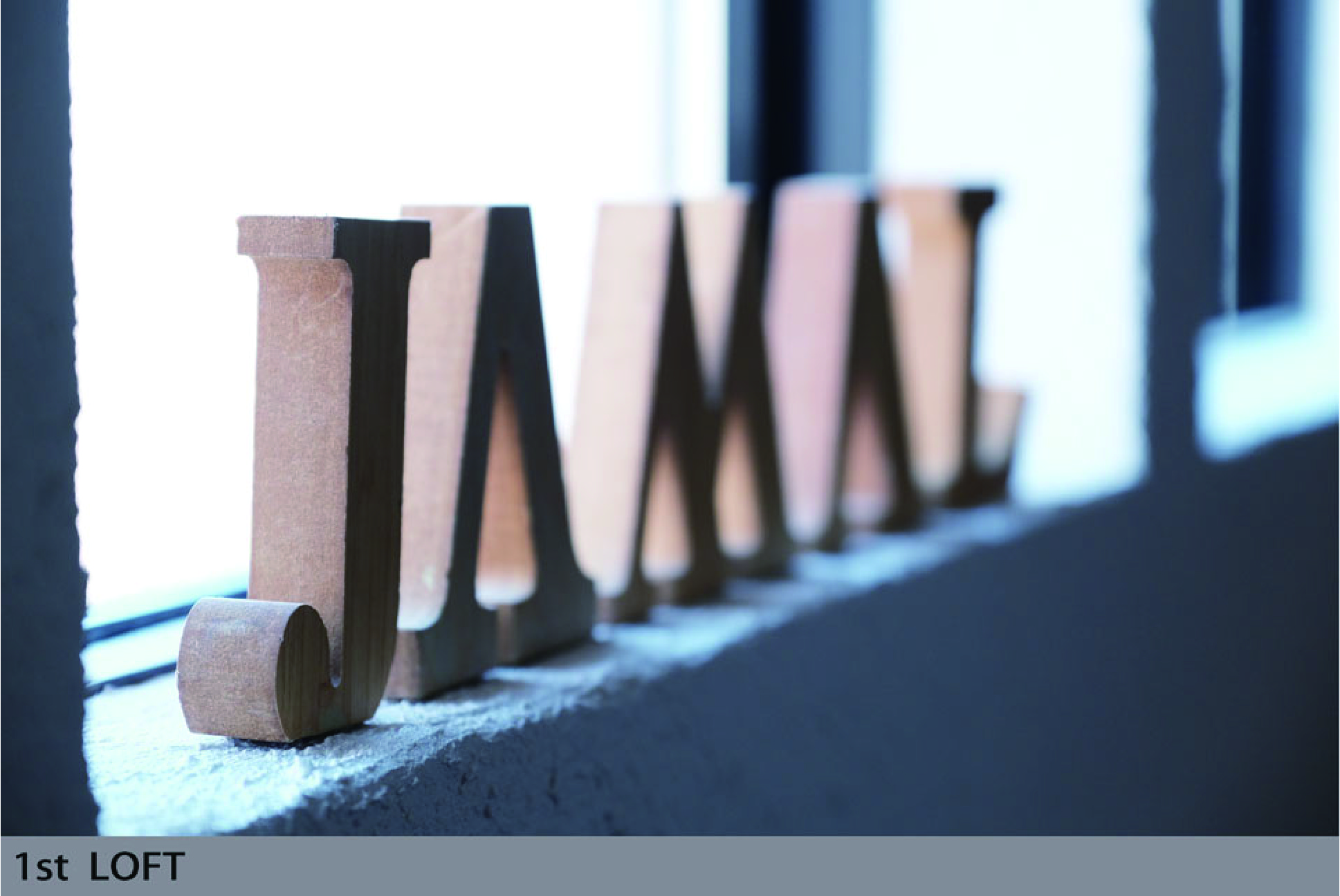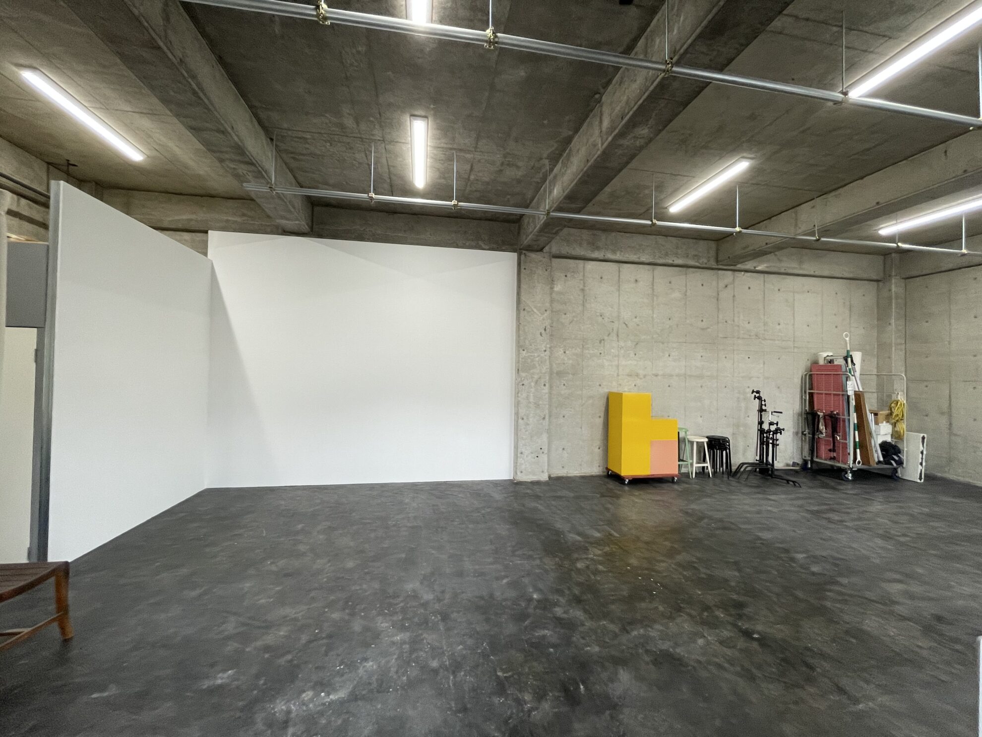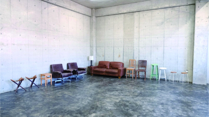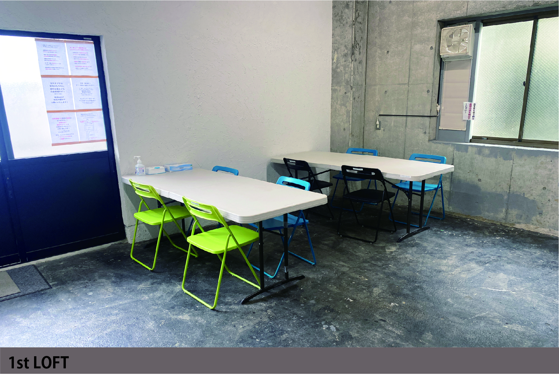 「1st LOFT」は天井高約4mの倉庫風スタジオ。コンクリ壁と黒塗り床にモダンな家具でまとめられたインダストリアルでスタイリッシュなイメージの空間です。