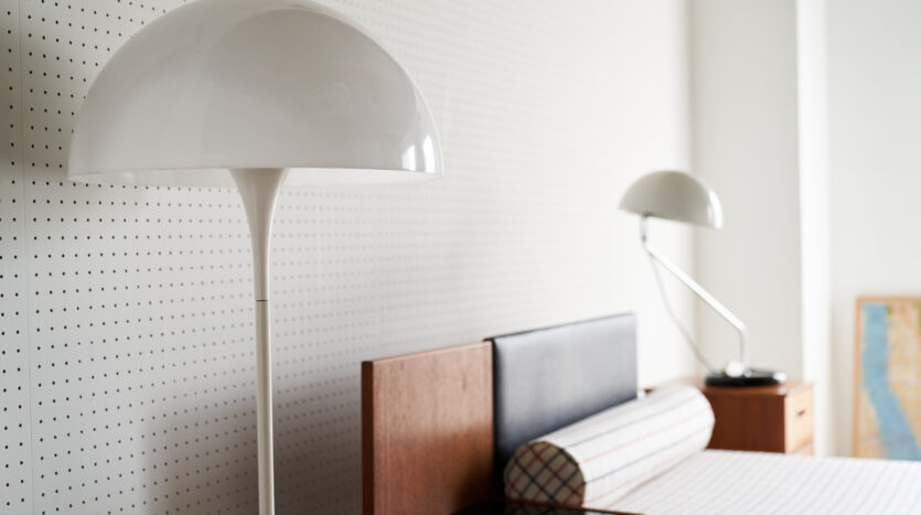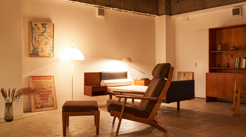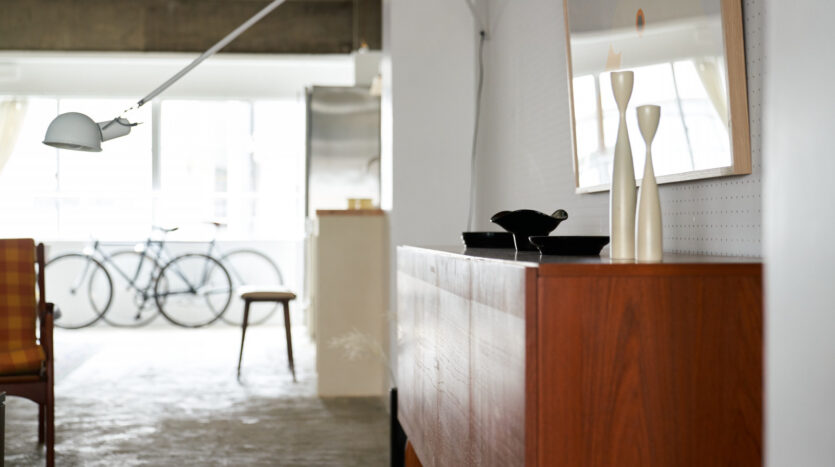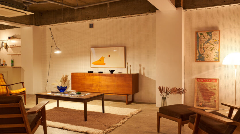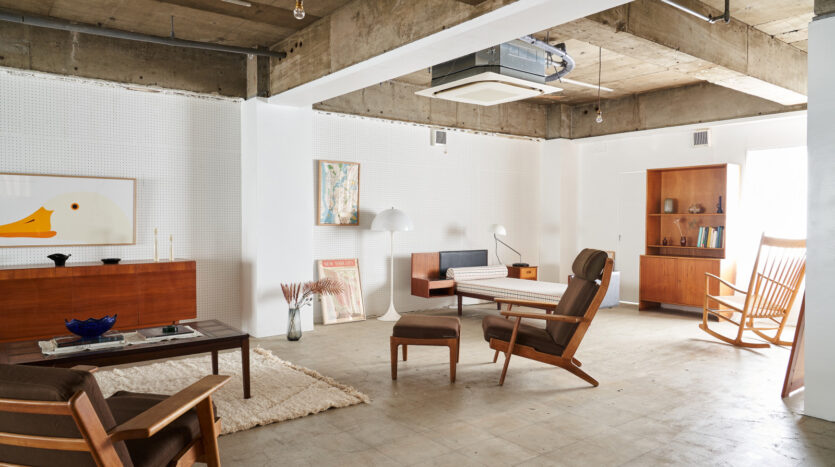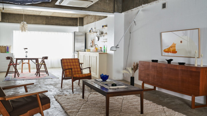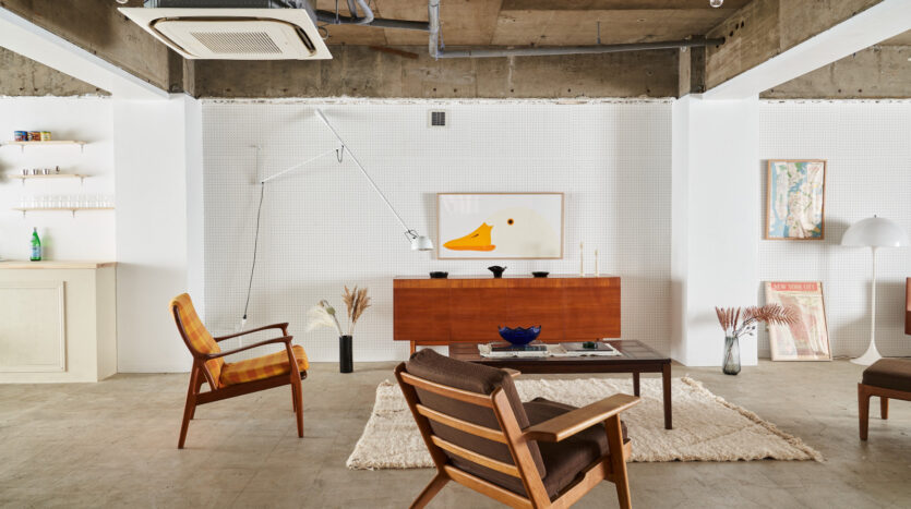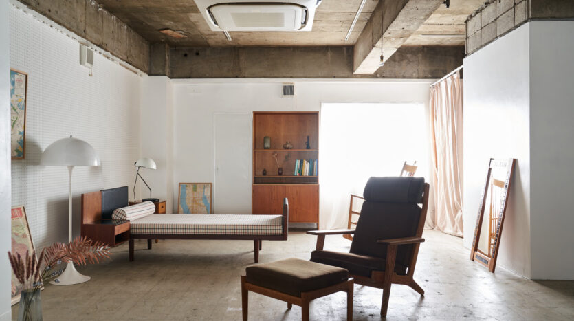 スタジオ内は、モルタル床に白く塗装されたパンチングボードと真っ白なモルタル壁、スケルトンで配管むき出しとなったコンクリート打ち放しの天井にハンス・ウェグナーのオリジナル家具を中心としたヴィンテージの北欧家具で構成されたスタイリッシュな空間となっています。