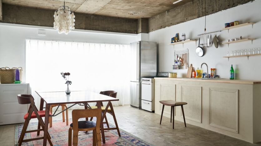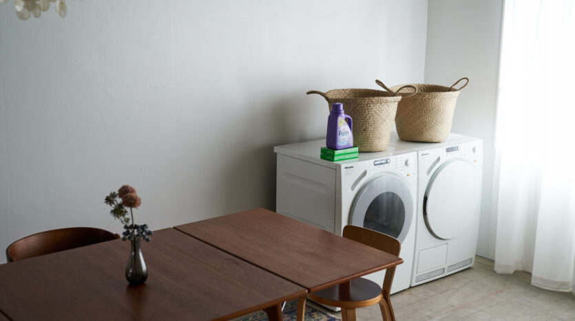 kohlerのホーローシンクを設置したお洒落なキッチンやmieleの洗濯機、乾燥機、ベッドなども取り揃えられ、ゆったりとしたワンルームのような空間となっており、生活シーンの撮影にも利用できます(調理や洗濯はできません)。