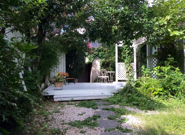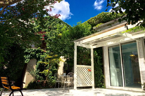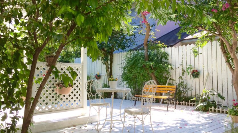 京王井の頭線「明大前駅」から徒歩5分、閑静な住宅街にある一軒家ハウススタジオです。白いウッドデッキとフェンスに囲まれたテラススペースには木漏れ日が射し、たくさんの木々に囲まれたスタジオは、都内に居ながら豊かな自然を感じられる空間となっています。