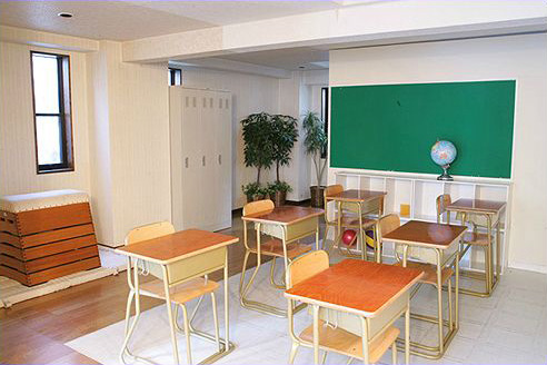 1階には吹抜のリビングと洋室がならび、アンティークな家具が設置されています。ゆったりとしたキッチンスペースとバスルームも用意され、ハウススタジオとして利用できるスペースです。一転して、跳び箱や黒板、学習机が並ぶ学校の教室を模した部屋があり、コスプレ撮影など幅広い用途に使えます。