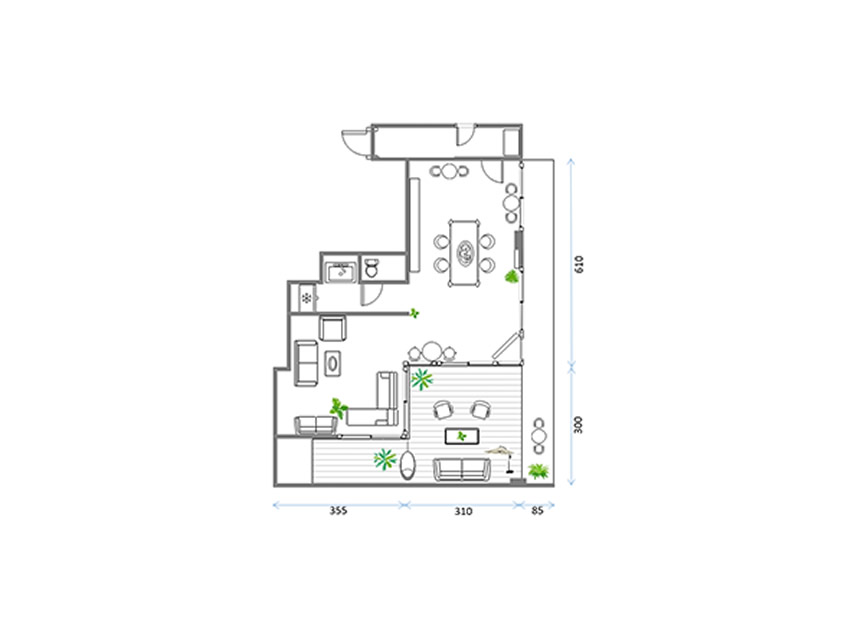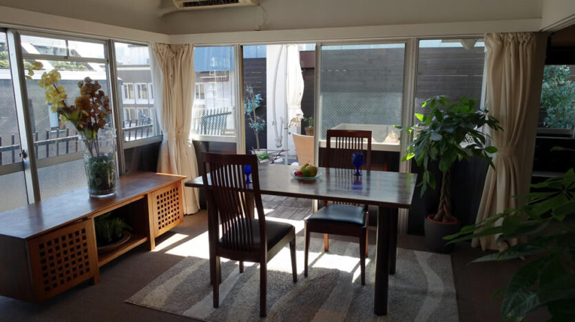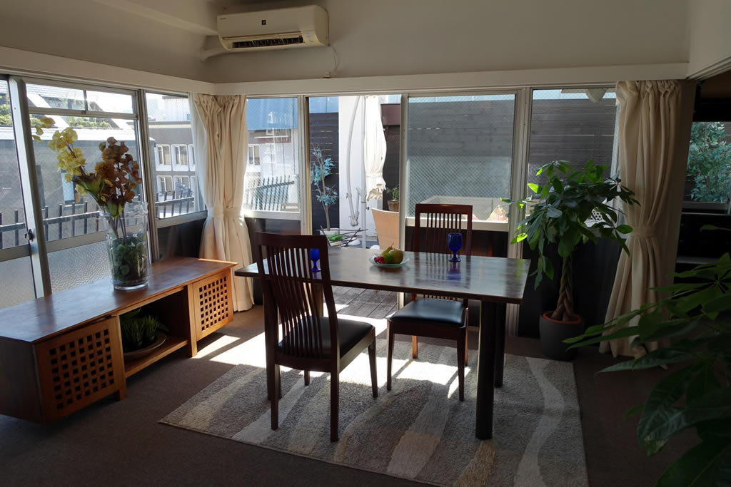 角部屋で自然光が豊富に入る室内は、使い勝手のよい1LDKの間取りとなっており、白基調のシンプルな内装にこだわって選ばれた家具や各国の雑貨や小物がならび、アットホームながらもモダンな空間を演出しています。さらに25㎡もの広さの開放的なルーフバルコニーがあり、洗練された都会のDINKs世帯の生活や、ゆとりあるシングル生活をも再現できるスタジオとなっています。