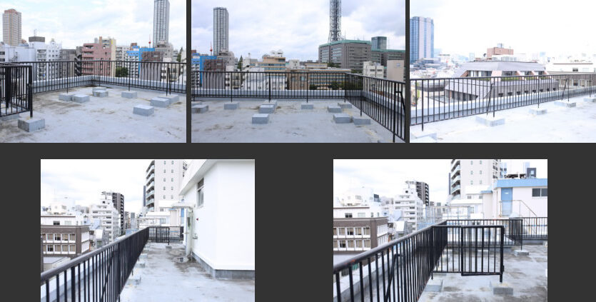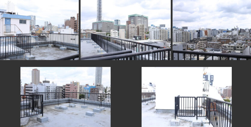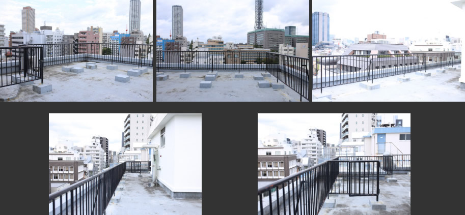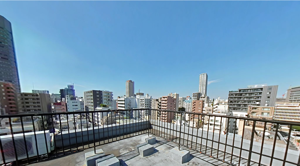 新宿区内四谷エリア、荒木町にある8階建てマンションの屋上スペースが撮影に利用できます。周辺に高い建築物がないため、約70㎡ある屋上から北東方面(東京ドーム方面)、南西方面(明治神宮方面)を遠くまで見渡せ、都心の街並み撮影に最適です。また空抜けもよいので、青空や星空を背景にした撮影もできます。