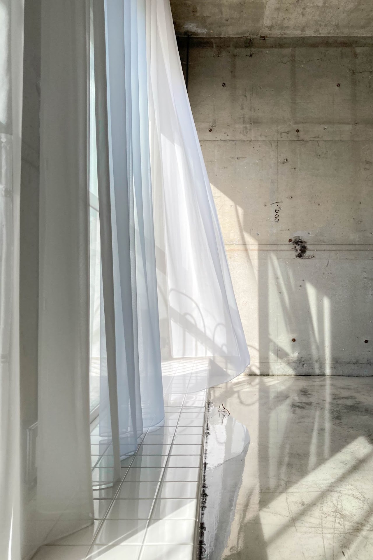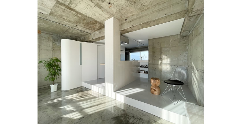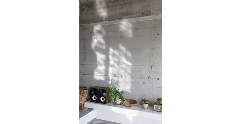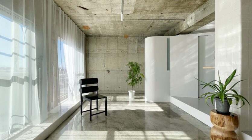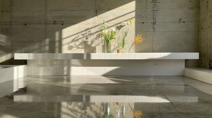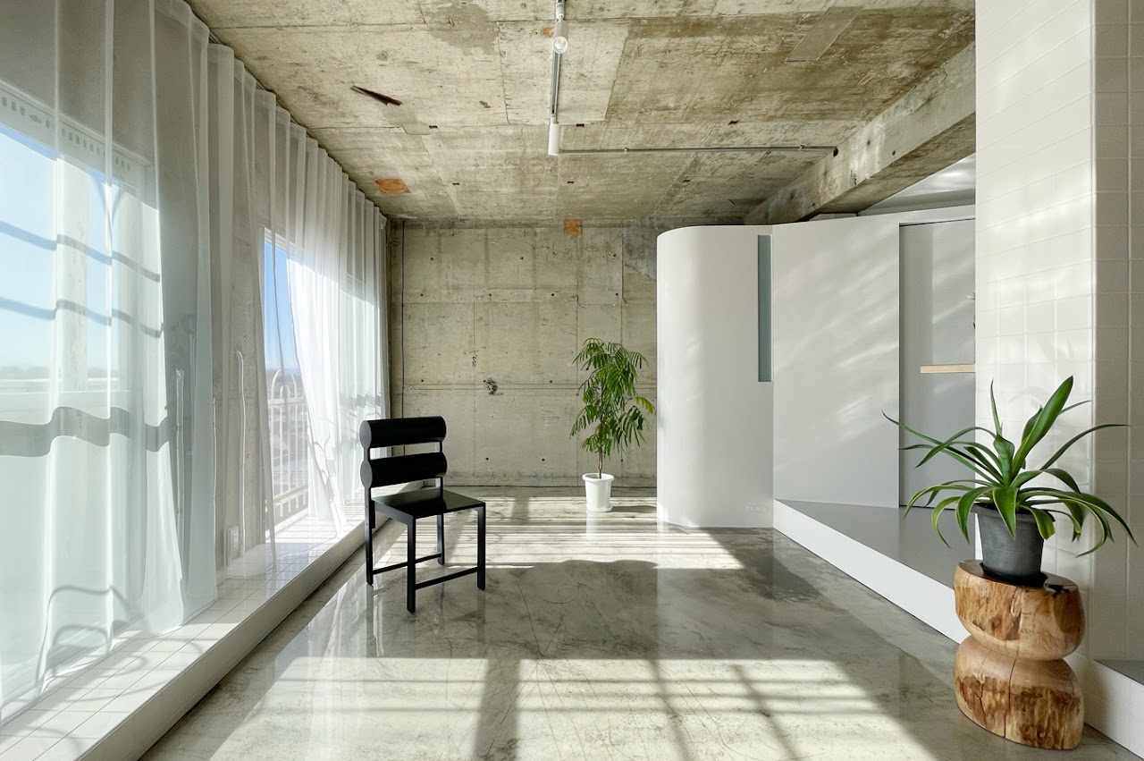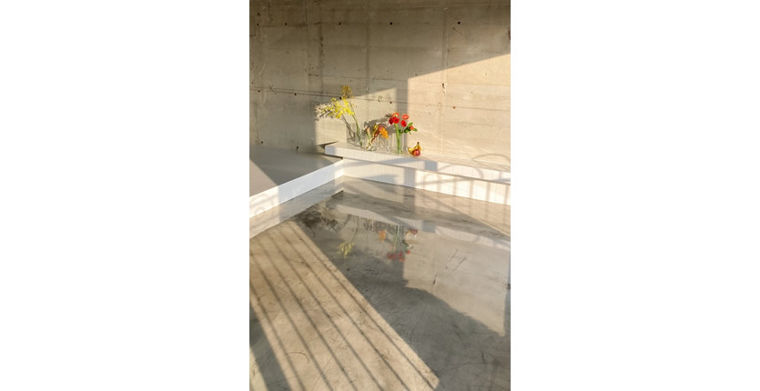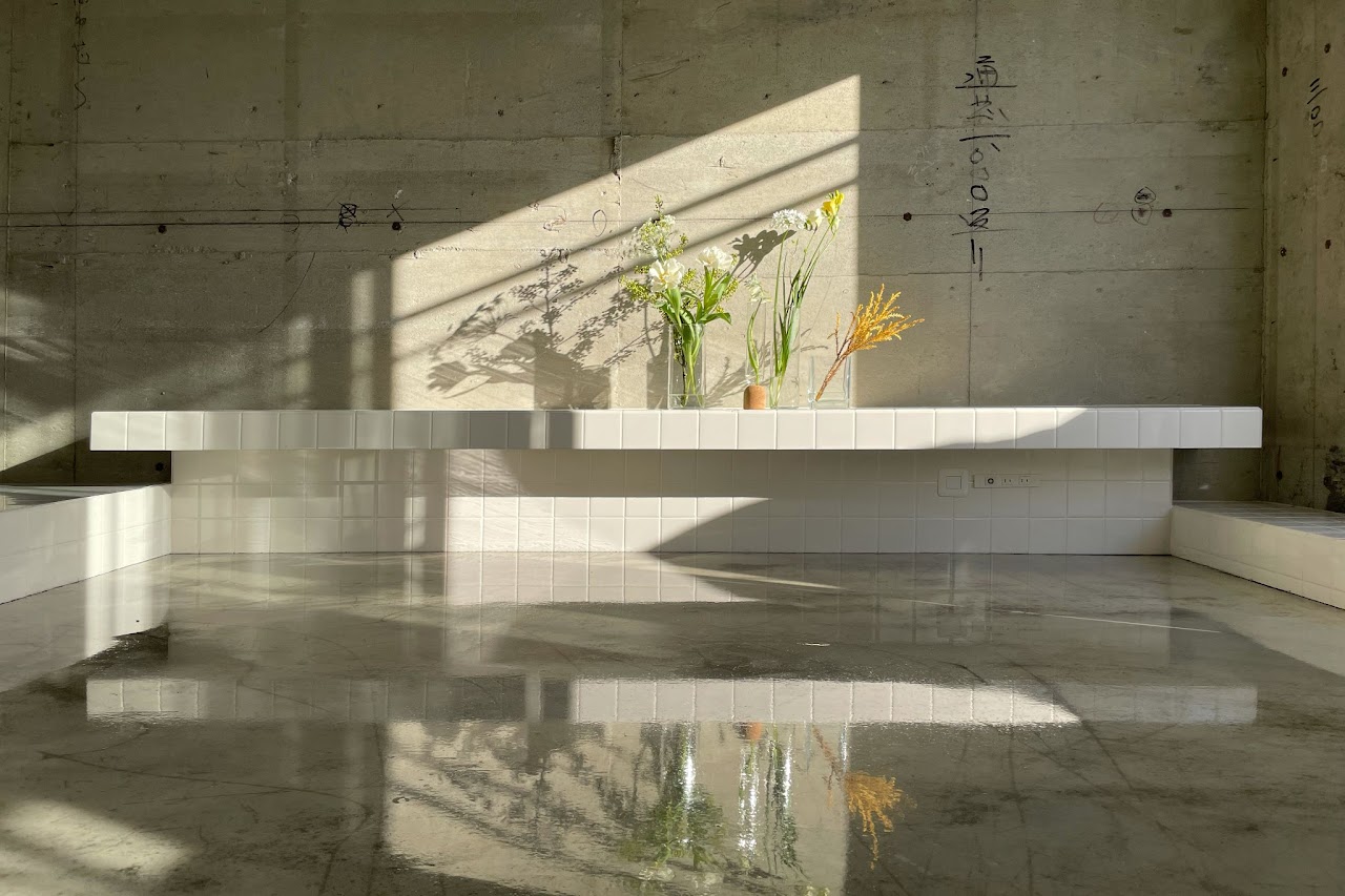 床、壁、天井共にコンクリート打ち放し仕上げとなっており、白いタイルと白壁がアクセントとなった、一見シンプルでクールモダンな内装。クリア塗装され鏡面仕上げの床が、たっぷりと降りそそぐ自然光を優しく反射し、静かな水面を見ているかのような幻想的な雰囲気も醸し出しています。