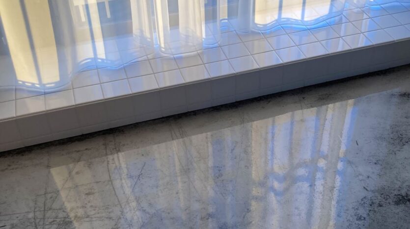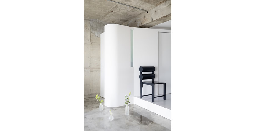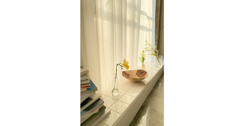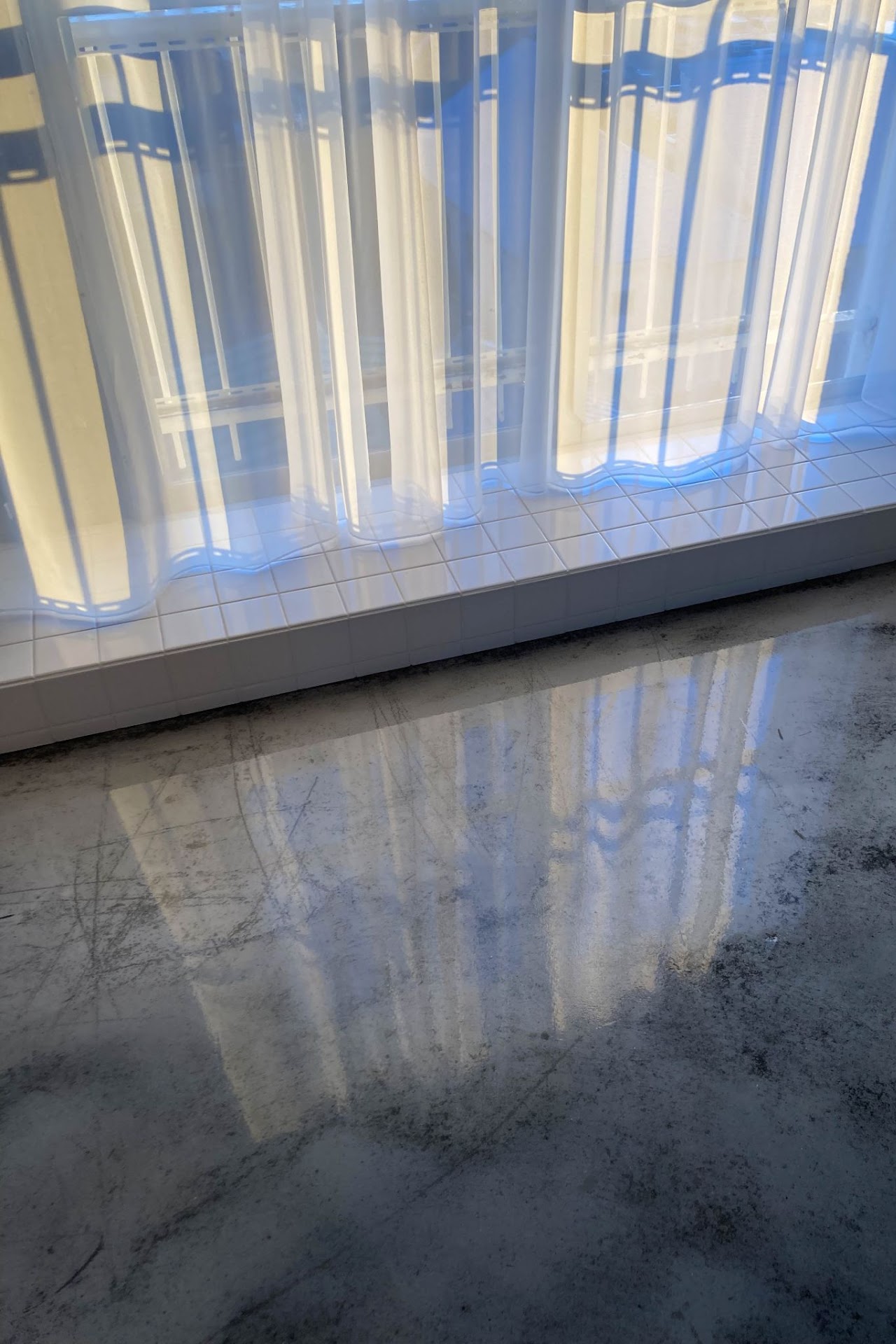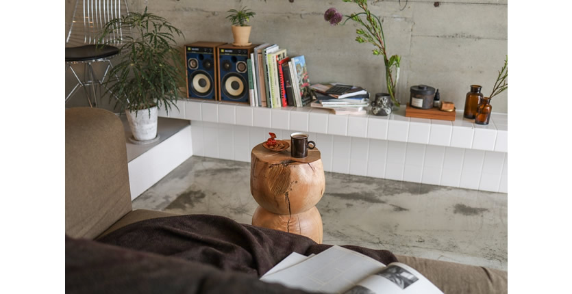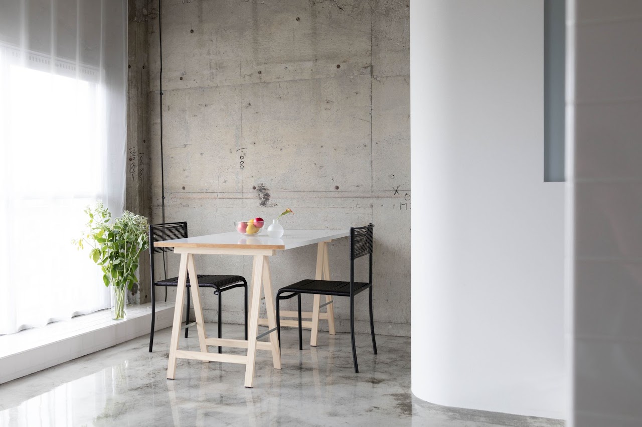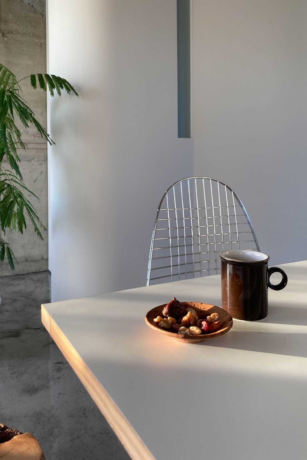 床、壁、天井共にコンクリート打ち放し仕上げとなっており、白いタイルと白壁がアクセントとなった、一見シンプルでクールモダンな内装。クリア塗装され鏡面仕上げの床が、たっぷりと降りそそぐ自然光を優しく反射し、静かな水面を見ているかのような幻想的な雰囲気も醸し出しています。