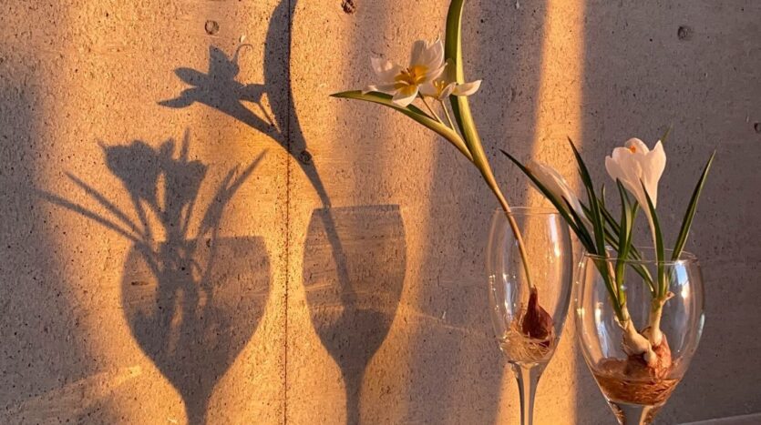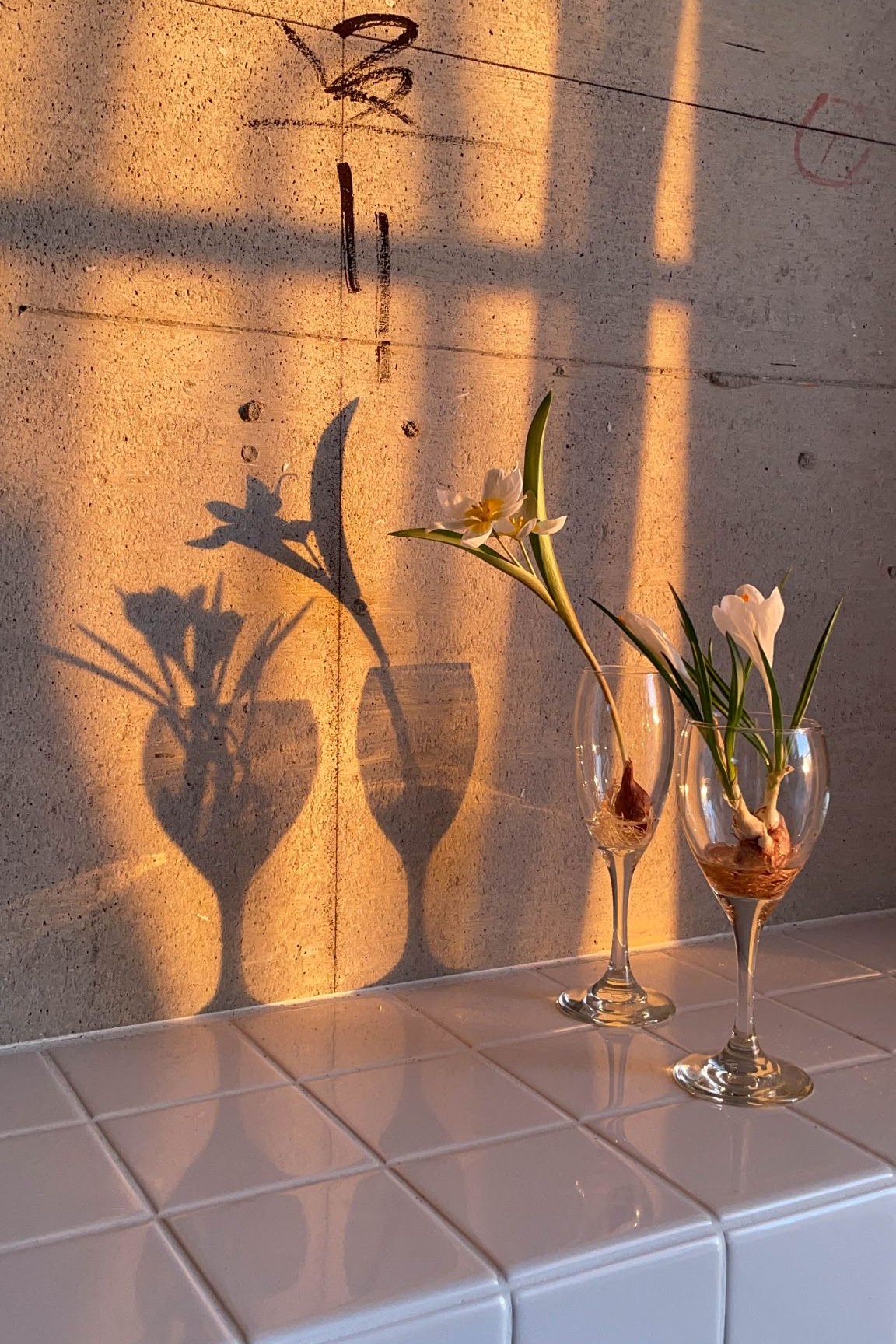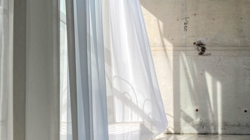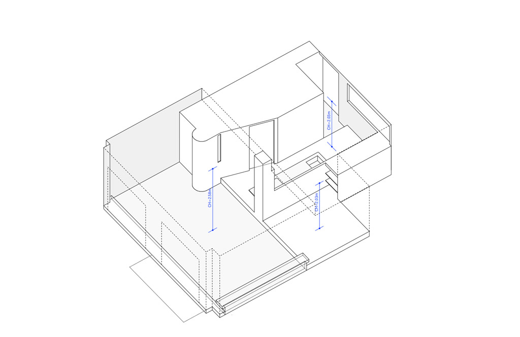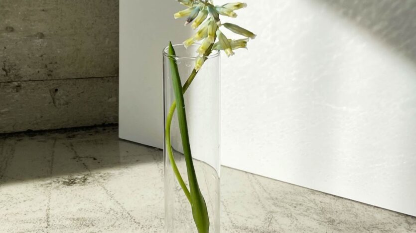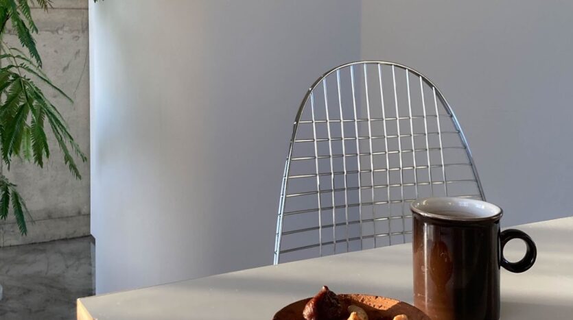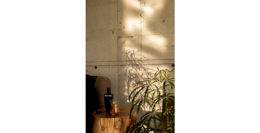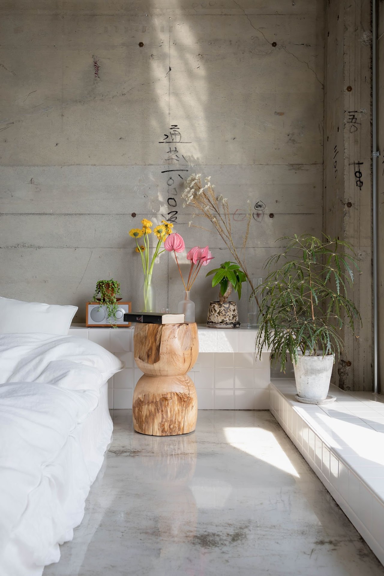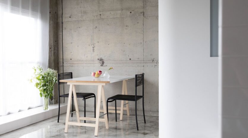 床、壁、天井共にコンクリート打ち放し仕上げとなっており、白いタイルと白壁がアクセントとなった、一見シンプルでクールモダンな内装。クリア塗装され鏡面仕上げの床が、たっぷりと降りそそぐ自然光を優しく反射し、静かな水面を見ているかのような幻想的な雰囲気も醸し出しています。
