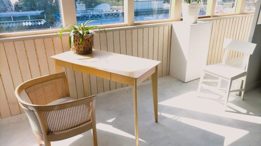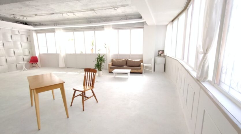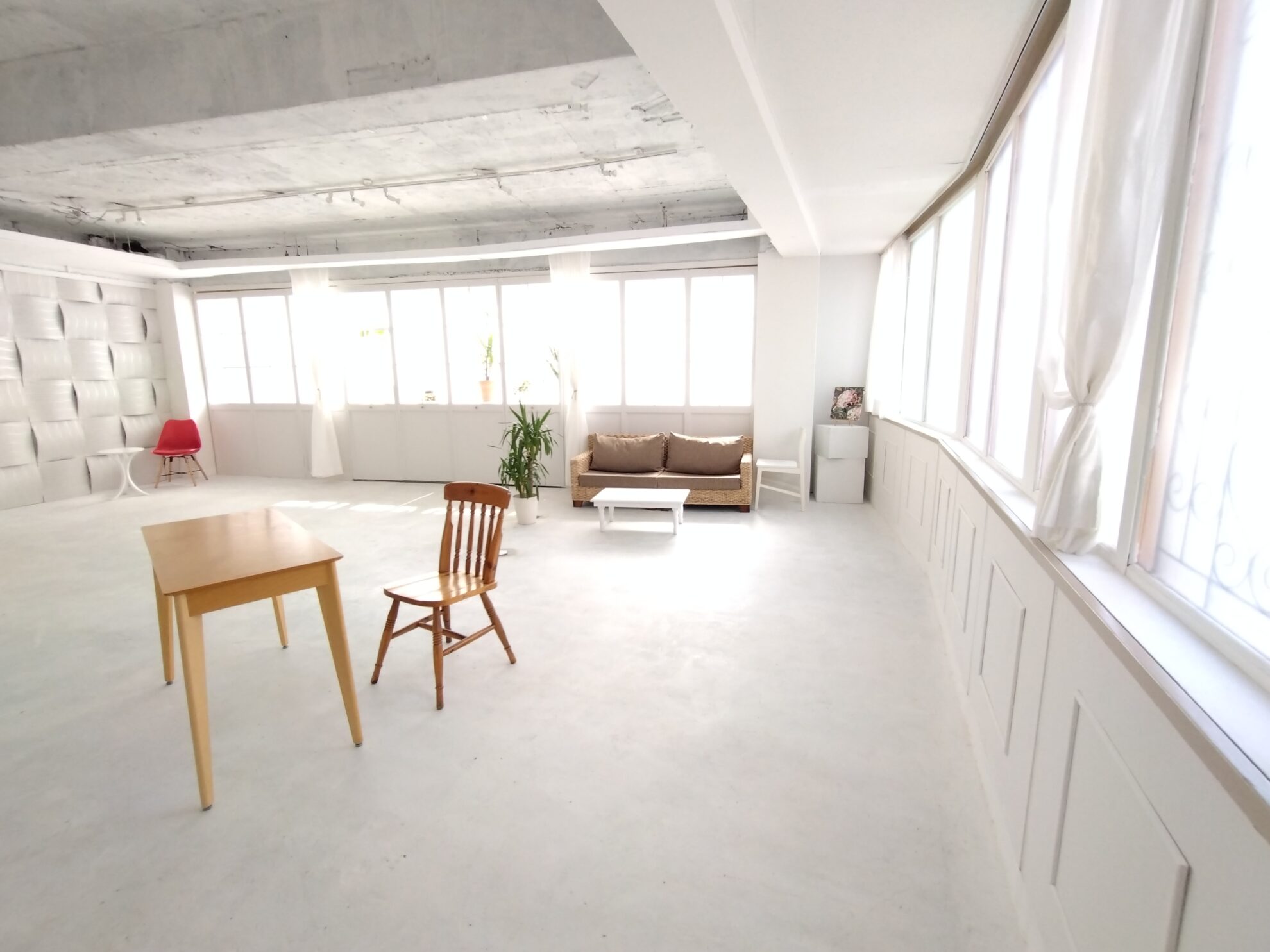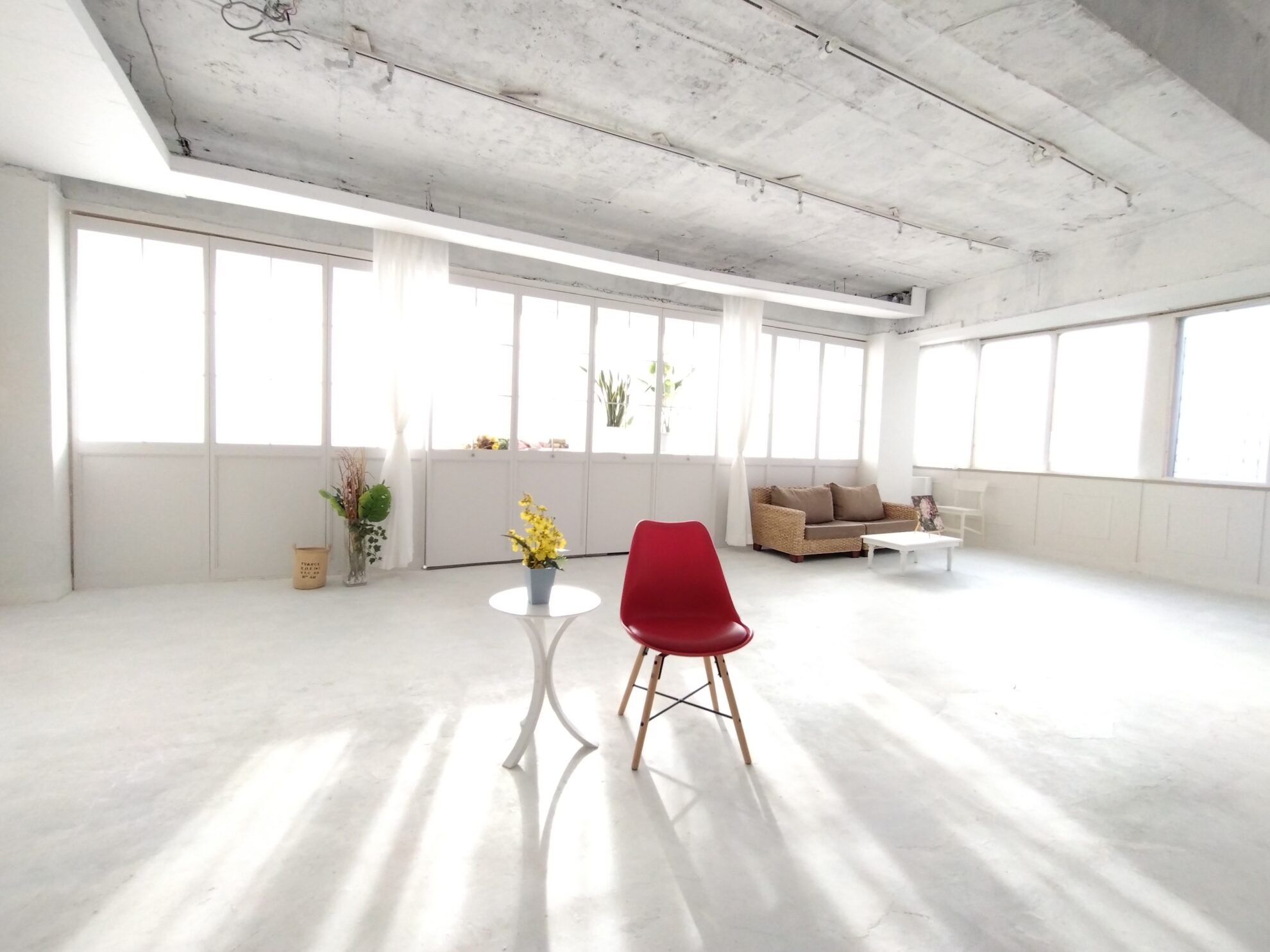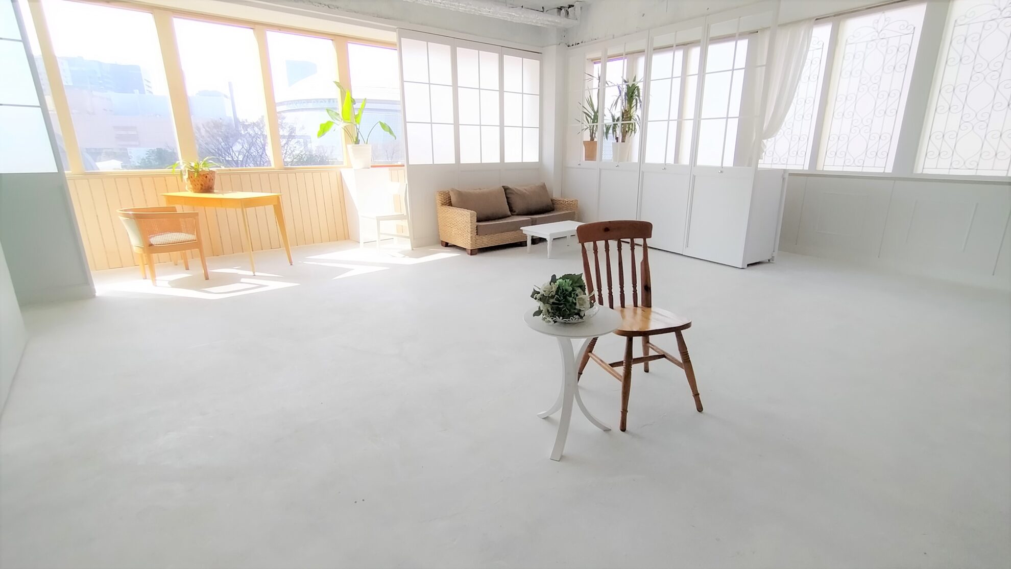 「太陽光を活かせるスタジオ」にこだわりをもって作られた室内は、2面の窓からたっぷりと自然光が降りそそぎ、85㎡ある白基調の空間をさらに広くみせます。サンルームを備えたメインの窓からは東京ドームやドームシティ、ラクーアを望め、これらを背景にした撮影も可能です。