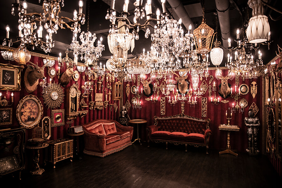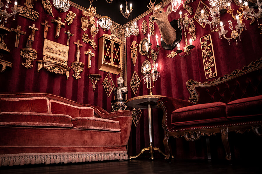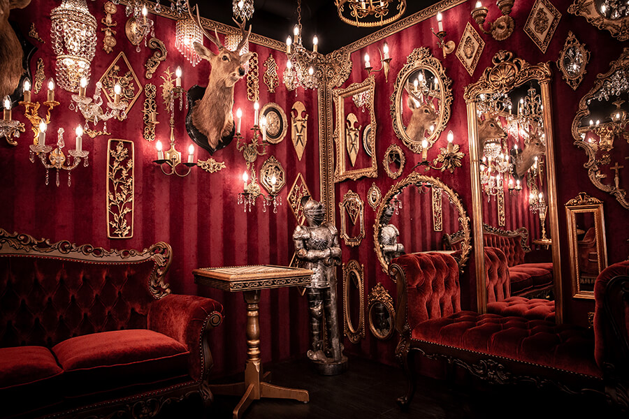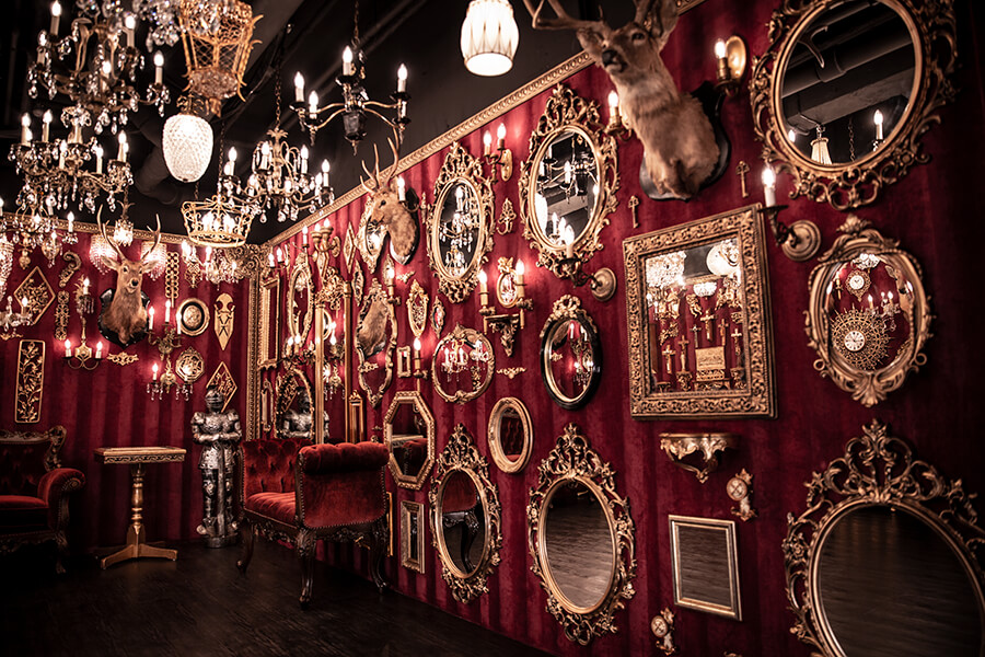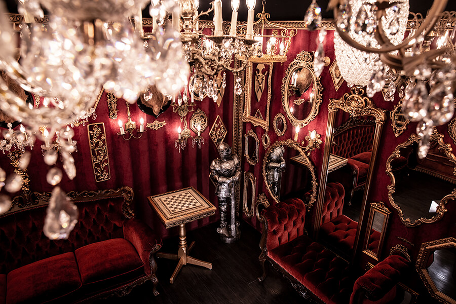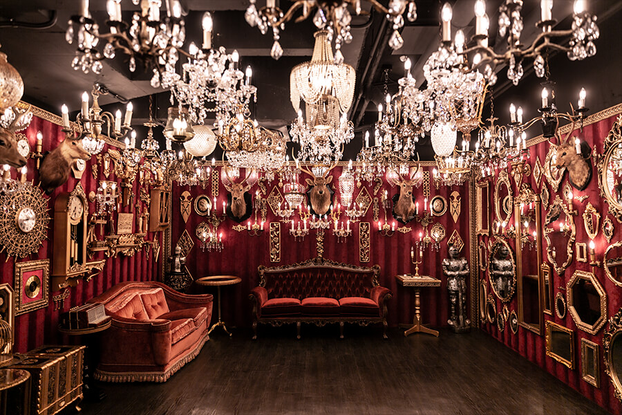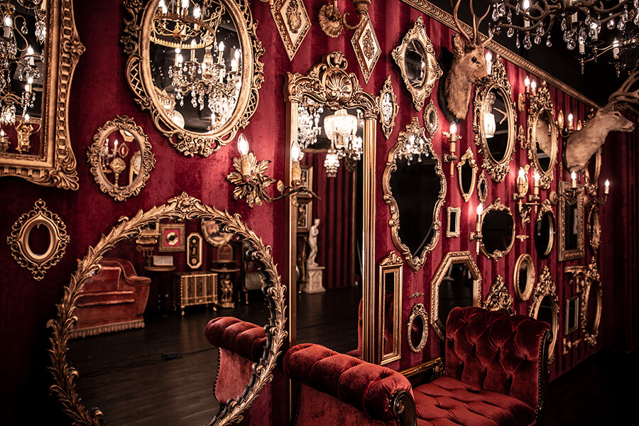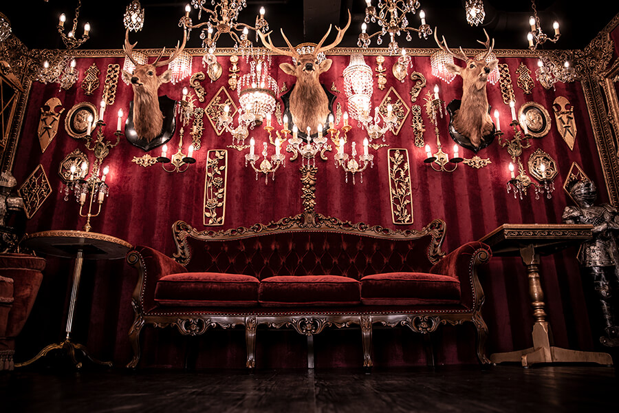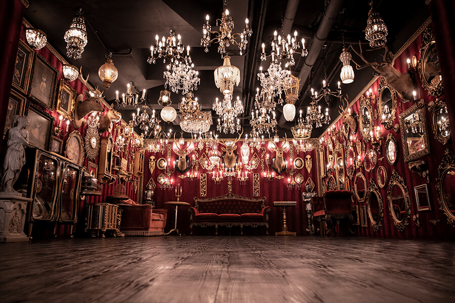 スタジオ内は、ダークウッドのフローリングとアクセントにゴールドを取り入れたワインレッドの壁面で統一され、ゴージャスかつ高級感のある空間。渋谷のクラブ「TRUMP ROOM」の内装に使われたアンティーク調のプロップとシャンデリアを数多く使用しており、一歩踏み入れた途端、異世界に迷い込んだような不思議な感覚が広がります。