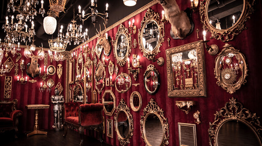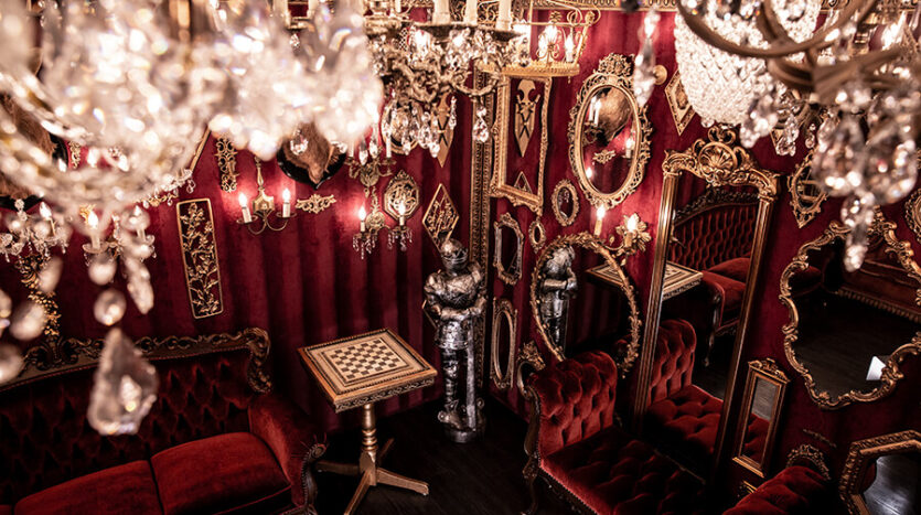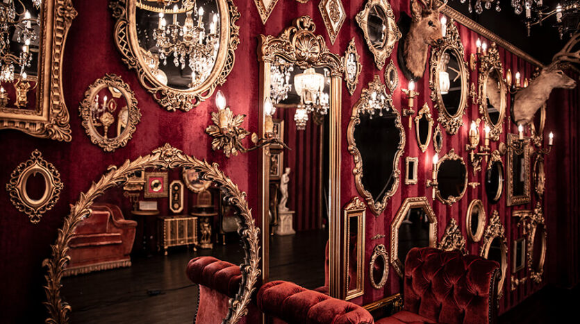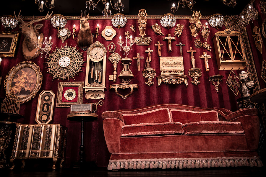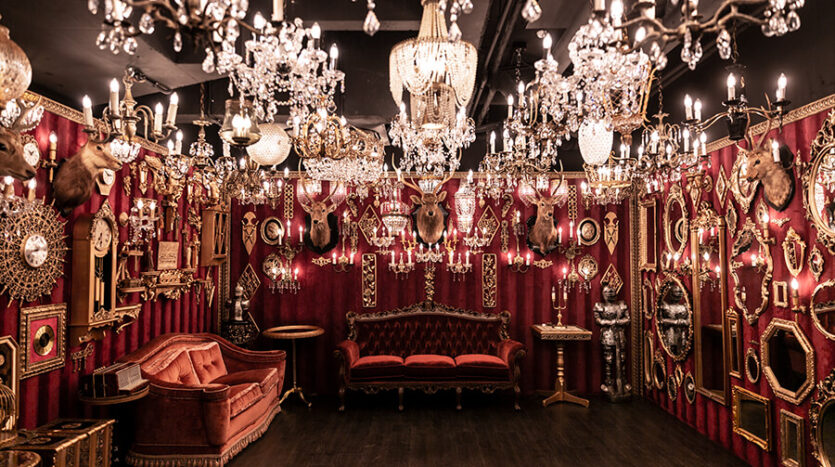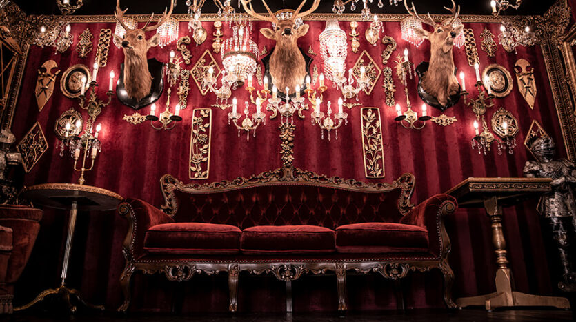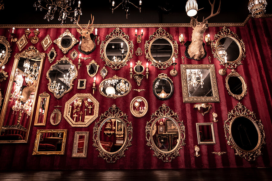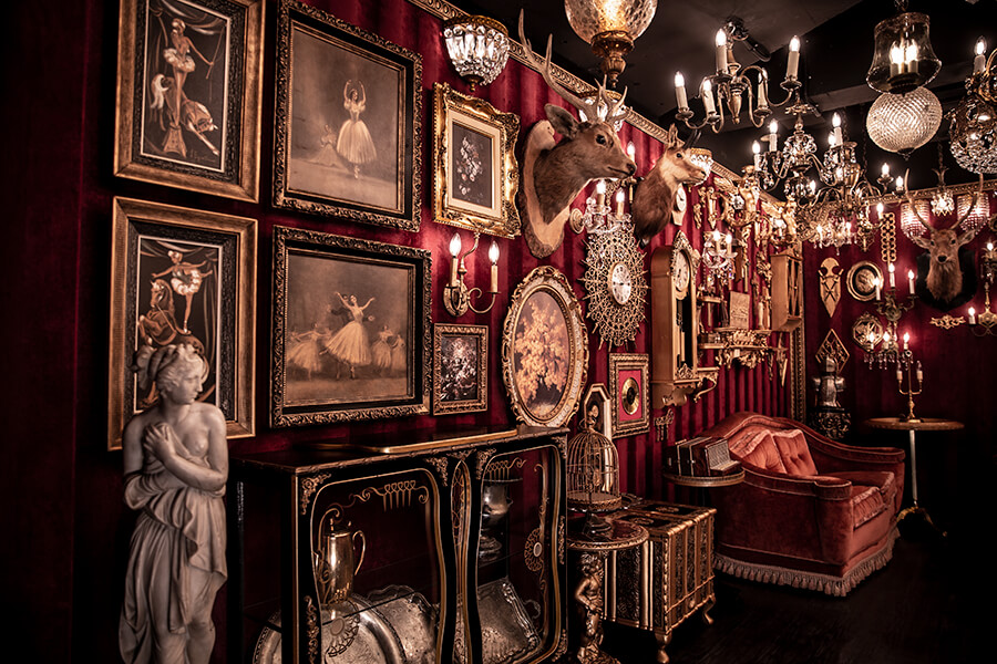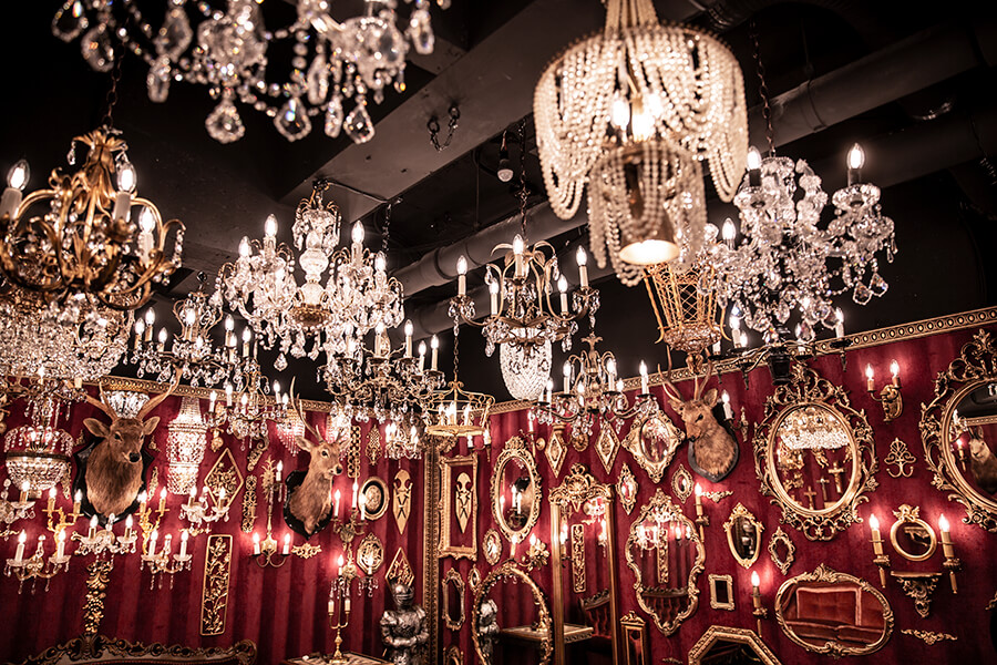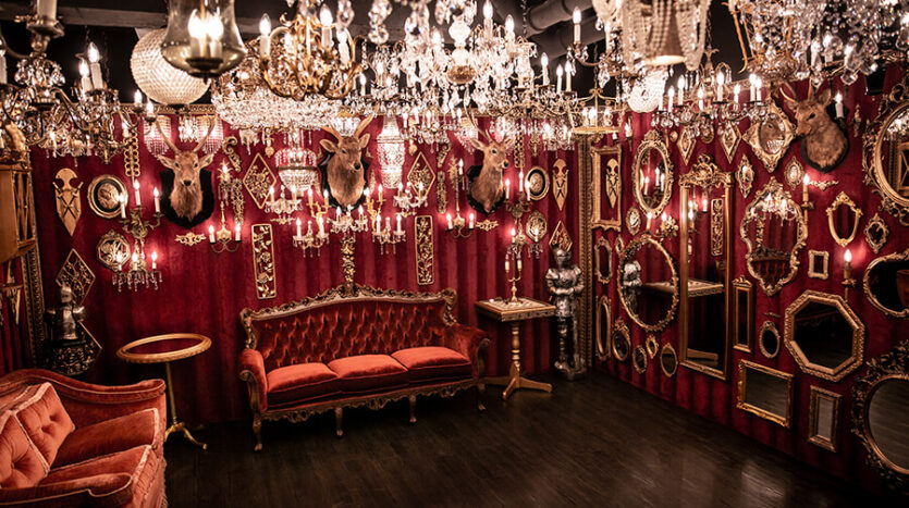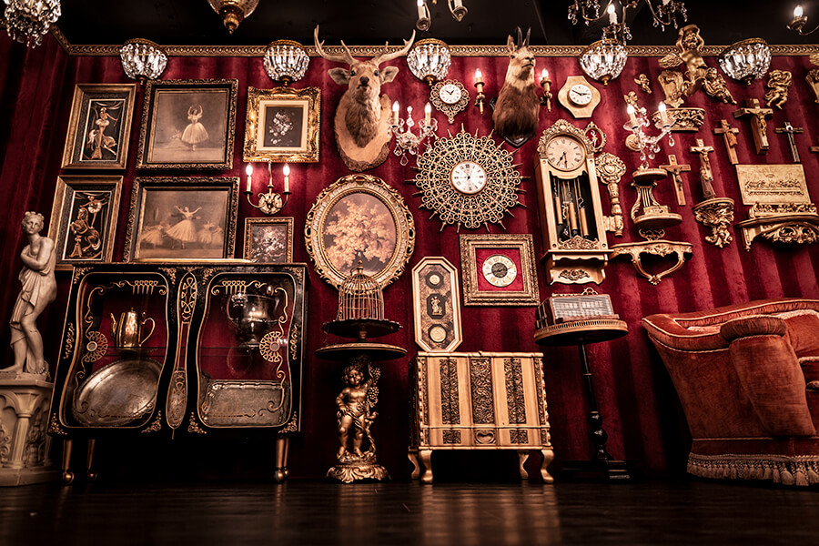 スタジオ内は、ダークウッドのフローリングとアクセントにゴールドを取り入れたワインレッドの壁面で統一され、ゴージャスかつ高級感のある空間。渋谷のクラブ「TRUMP ROOM」の内装に使われたアンティーク調のプロップとシャンデリアを数多く使用しており、一歩踏み入れた途端、異世界に迷い込んだような不思議な感覚が広がります。