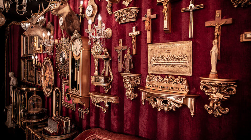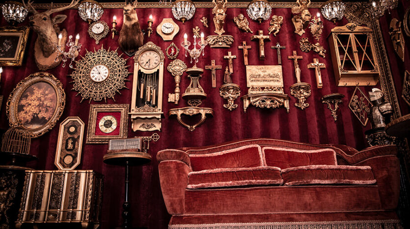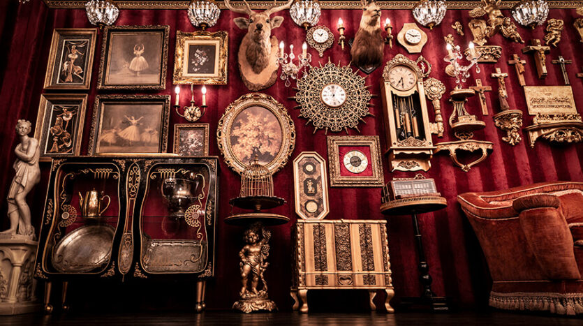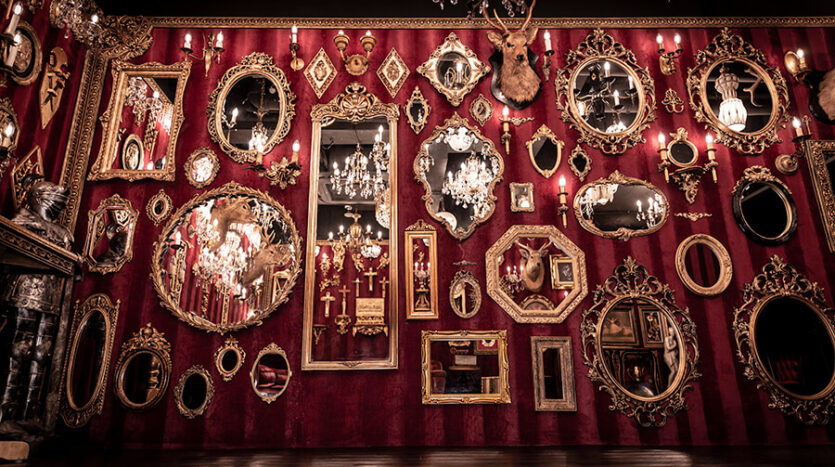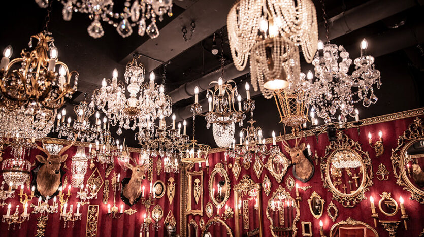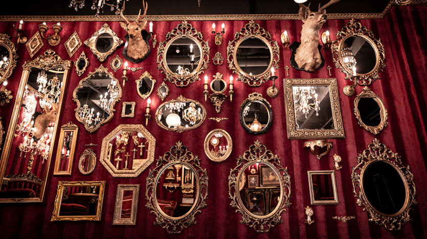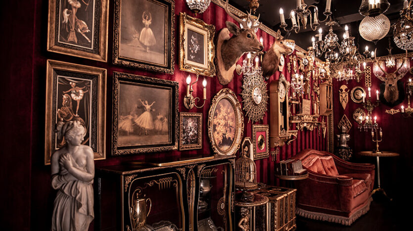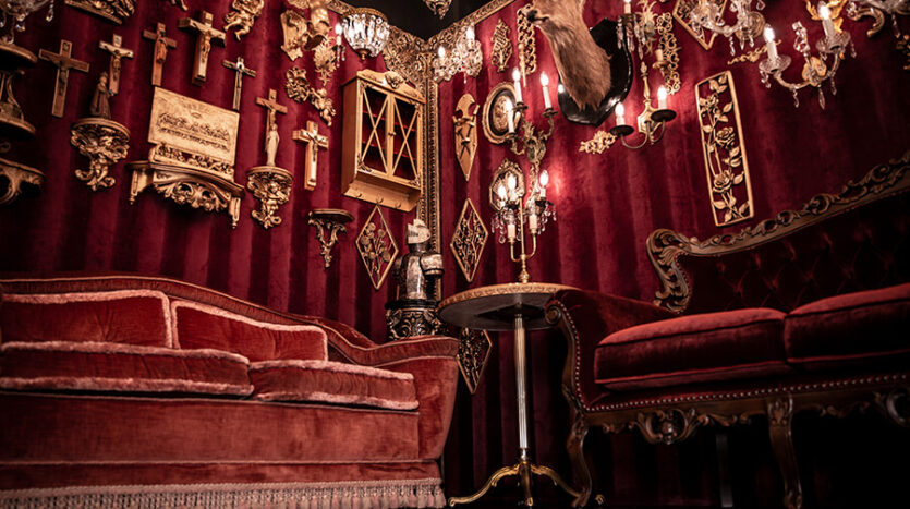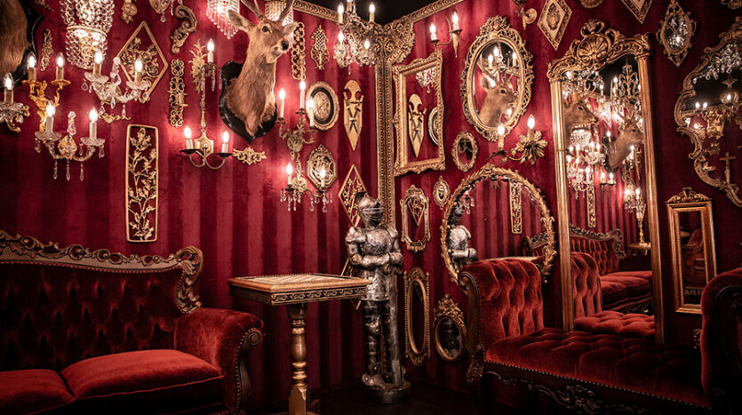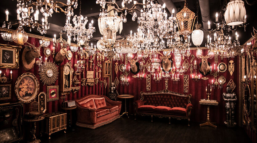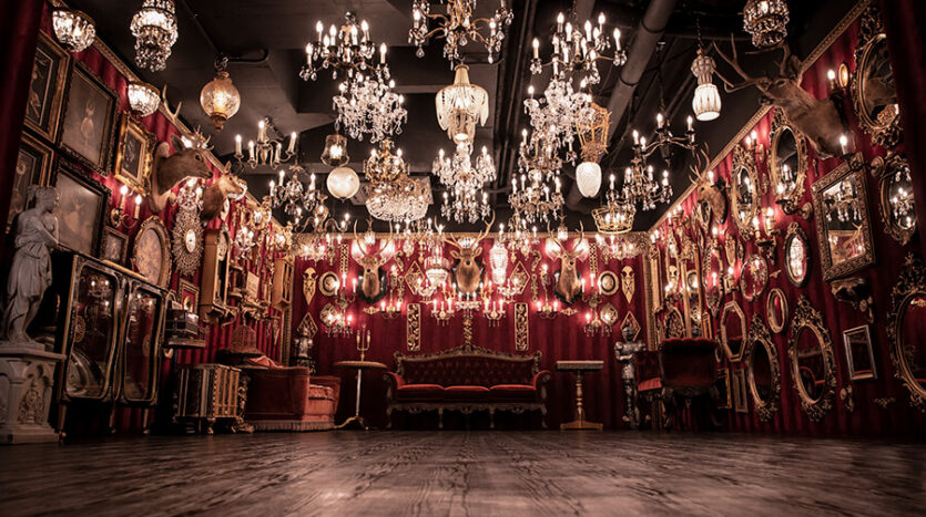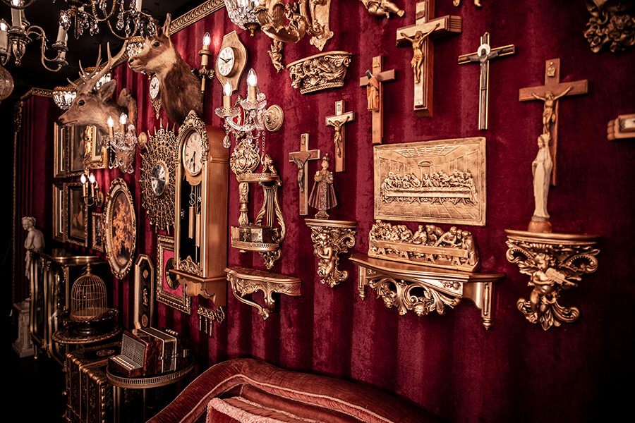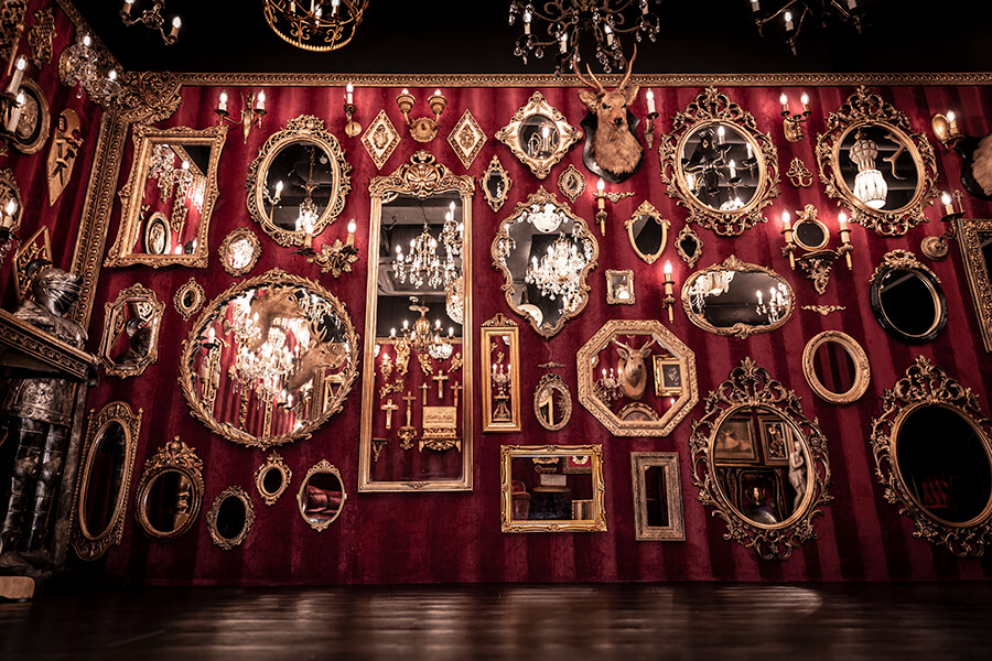 スタジオ内は、ダークウッドのフローリングとアクセントにゴールドを取り入れたワインレッドの壁面で統一され、ゴージャスかつ高級感のある空間。渋谷のクラブ「TRUMP ROOM」の内装に使われたアンティーク調のプロップとシャンデリアを数多く使用しており、一歩踏み入れた途端、異世界に迷い込んだような不思議な感覚が広がります。